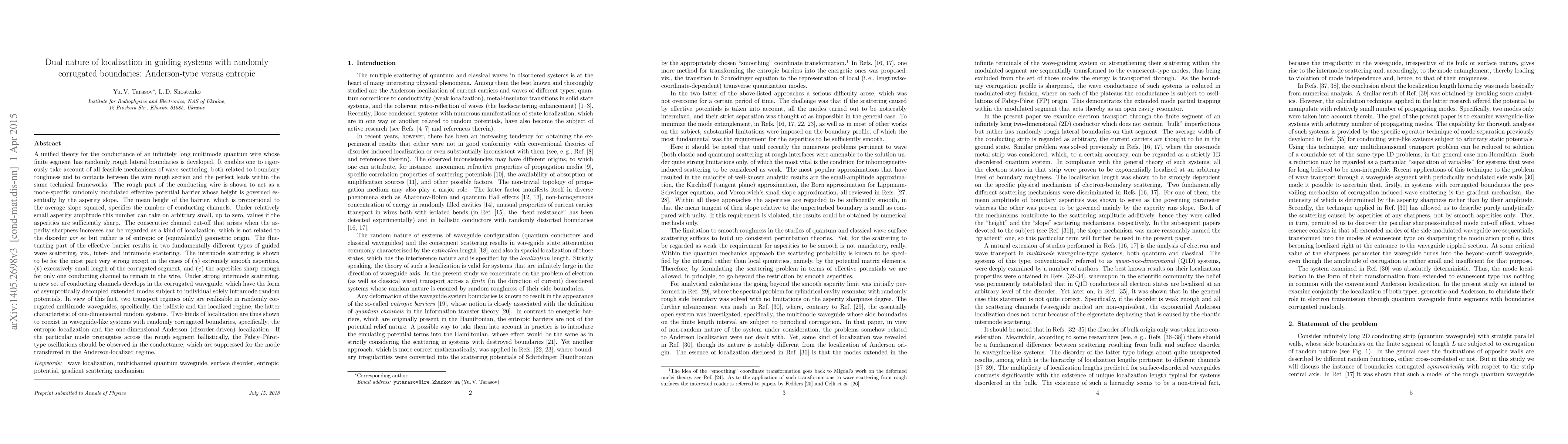 A unified theory for the conductance of a long multimode quantum wire whose finite segment has randomly rough boundaries is developed. It enables one to take account of all mechanisms of wave scattering, both related to boundary roughness and to contacts between the wire rough section and the leads within the same technical frameworks. The rough part of the conducting wire is shown to act as a mode-specific randomly modulated effective potential barrier whose height is governed essentially by the asperity slope. The mean height of the barrier specifies the number of conducting channels. Under relatively small asperity amplitude this number can take on arbitrary small values if the asperities are sufficiently sharp. The channel cut-off that arises when the asperity sharpness increases can be regarded as a kind of localization, which is not related to the disorder but rather is of entropic origin. The fluctuating part of the barrier results in two fundamentally different types of guided wave scattering, viz., inter- and intramode scattering. The intermode scattering is shown to be for the most part very strong except in the cases of (a) extremely smooth asperities, (b) excessively small length of the corrugated segment, and (c) the asperities sharp enough for only one conducting channel to remain in the wire. Under strong intermode scattering, a new set of conducting channels develops, which have the form of decoupled extended modes subject to individual random potentials. In view of this fact, two transport regimes only are realizable in randomly corrugated multimode wires, specifically, the ballistic and the localized regime, the latter characteristic of one-dimensional random systems. Two kinds of localization are thus shown to coexist in waveguide-like systems with randomly corrugated boundaries, specifically, the entropic localization and the one-dimensional Anderson localization.