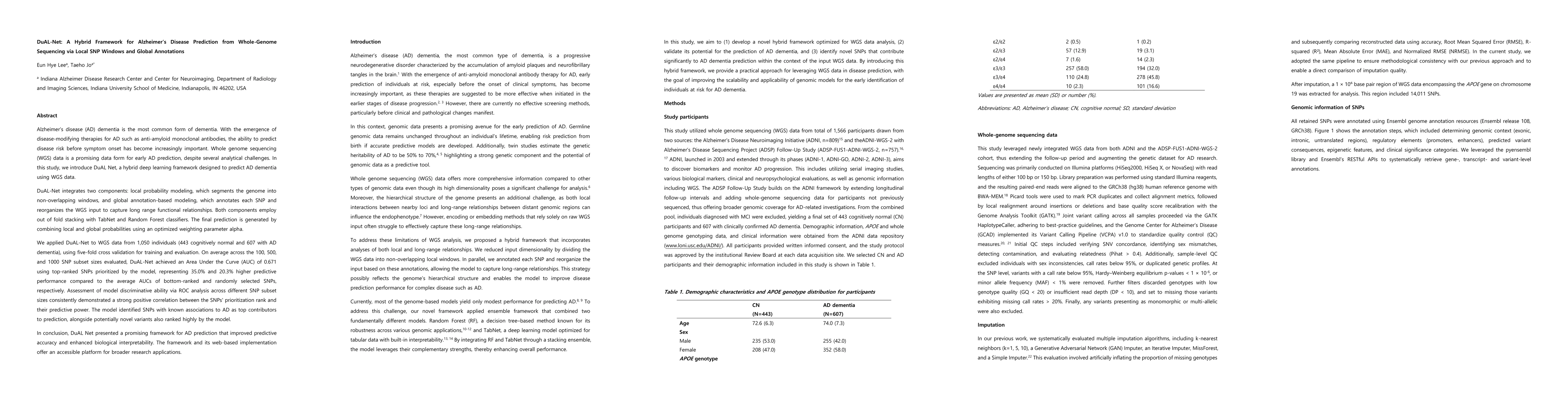 Alzheimer's disease (AD) dementia is the most common form of dementia. With the emergence of disease-modifying therapies, predicting disease risk before symptom onset has become critical. We introduce DuAL-Net, a hybrid deep learning framework for AD dementia prediction using whole genome sequencing (WGS) data. DuAL-Net integrates two components: local probability modeling, which segments the genome into non-overlapping windows, and global annotation-based modeling, which annotates SNPs and reorganizes WGS input to capture long-range functional relationships. Both employ out-of-fold stacking with TabNet and Random Forest classifiers. Final predictions combine local and global probabilities using an optimized weighting parameter alpha. We analyzed WGS data from 1,050 individuals (443 cognitively normal, 607 AD dementia) using five-fold cross-validation. DuAL-Net achieved an AUC of 0.671 using top-ranked SNPs, representing 35.0% and 20.3% higher performance than bottom-ranked and randomly selected SNPs, respectively. ROC analysis demonstrated strong positive correlation between SNP prioritization rank and predictive power. The model identified known AD-associated SNPs as top contributors alongside potentially novel variants. DuAL-Net presents a promising framework improving both predictive accuracy and biological interpretability. The framework and web implementation offer an accessible platform for broader research applications.