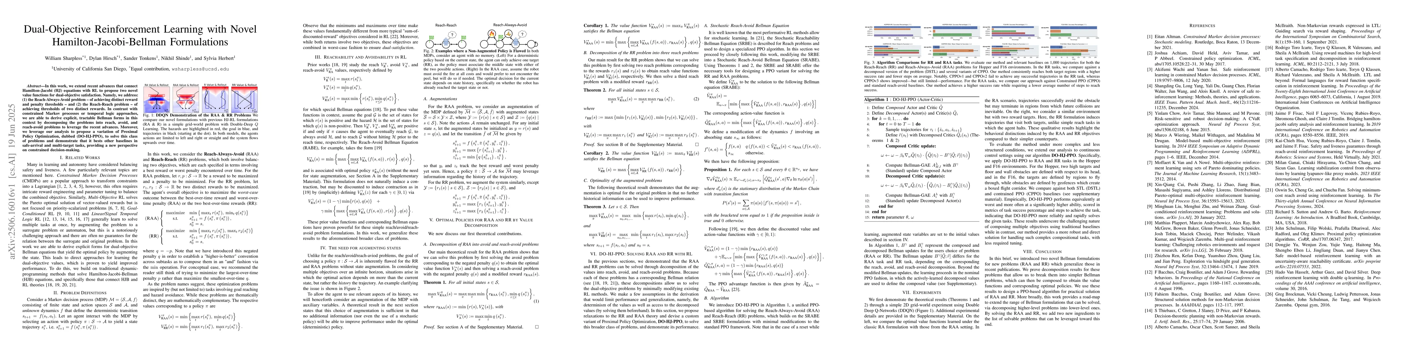 Hard constraints in reinforcement learning (RL), whether imposed via the reward function or the model architecture, often degrade policy performance. Lagrangian methods offer a way to blend objectives with constraints, but often require intricate reward engineering and parameter tuning. In this work, we extend recent advances that connect Hamilton-Jacobi (HJ) equations with RL to propose two novel value functions for dual-objective satisfaction. Namely, we address: (1) the Reach-Always-Avoid problem - of achieving distinct reward and penalty thresholds - and (2) the Reach-Reach problem - of achieving thresholds of two distinct rewards. In contrast with temporal logic approaches, which typically involve representing an automaton, we derive explicit, tractable Bellman forms in this context by decomposing our problem into reach, avoid, and reach-avoid problems, as to leverage these aforementioned recent advances. From a mathematical perspective, the Reach-Always-Avoid and Reach-Reach problems are complementary and fundamentally different from standard sum-of-rewards problems and temporal logic problems, providing a new perspective on constrained decision-making. We leverage our analysis to propose a variation of Proximal Policy Optimization (DO-HJ-PPO), which solves these problems. Across a range of tasks for safe-arrival and multi-target achievement, we demonstrate that DO-HJ-PPO produces qualitatively distinct behaviors from previous approaches and out-competes a number of baselines in various metrics.