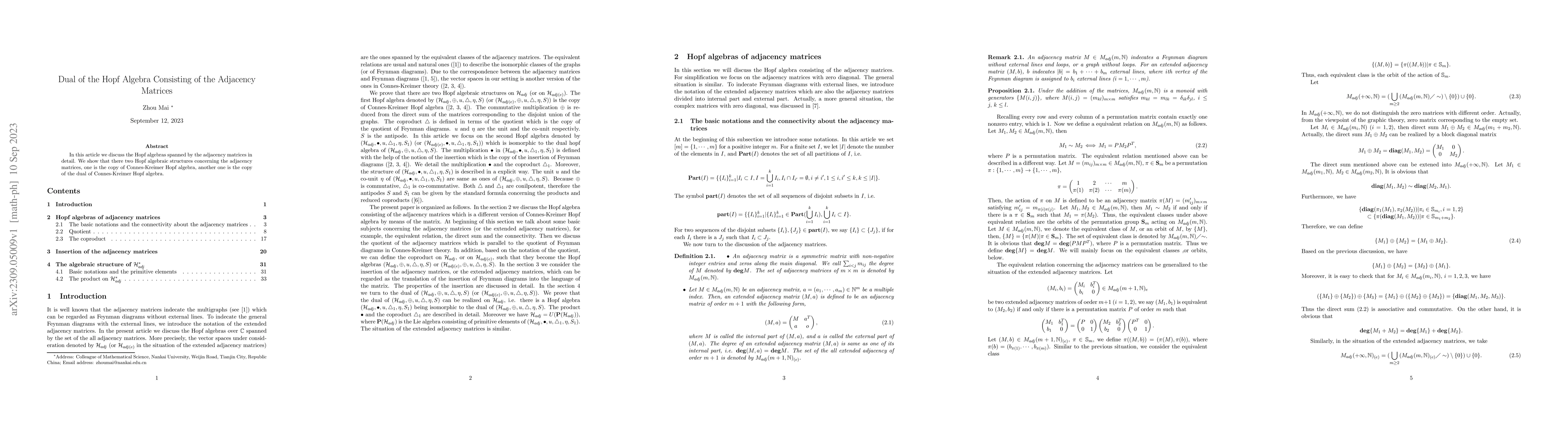 This paper explores the Hopf algebras formed by adjacency matrices, revealing two distinct Hopf algebraic structures: one aligns with the Connes-Kreimer Hopf algebra, while the other corresponds to its dual.