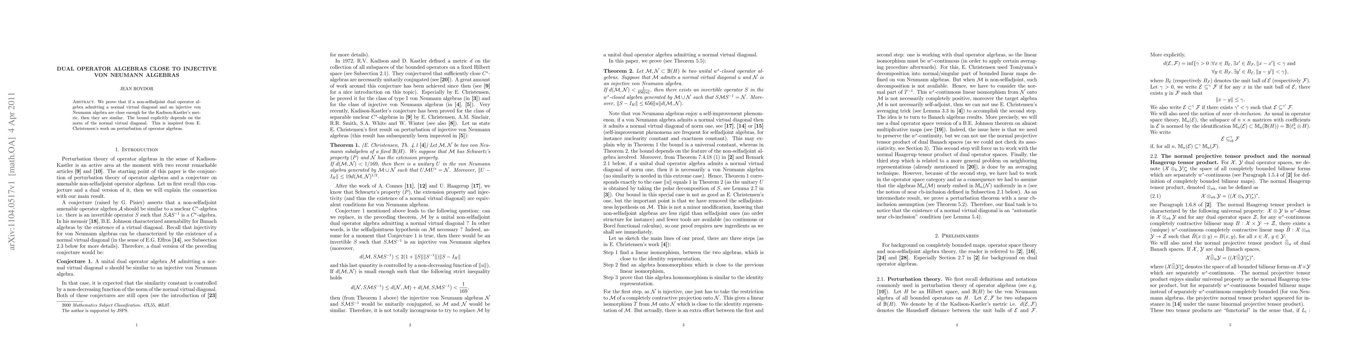 We prove that if a non-selfadjoint dual operator algebra admitting a normal virtual diagonal and an injective von Neumann algebra are close enough for the Kadison-Kastler's metric, then they are similar. The bound explicitly depends on the norm of the normal virtual diagonal. This is inspired from E. Christensen's work on perturbation of operator algebras.