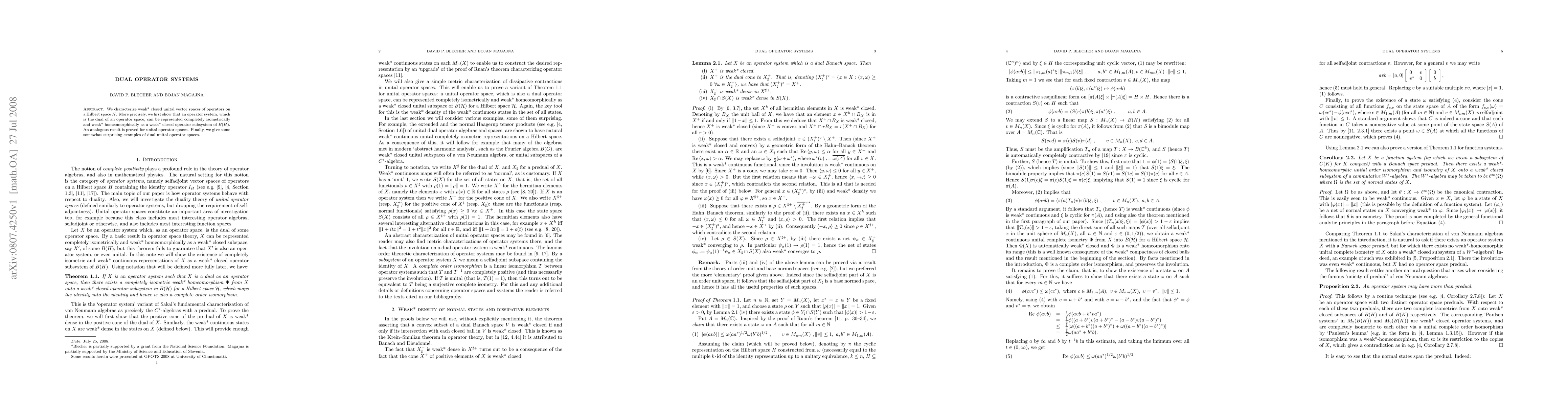 This research paper establishes a complete isometric representation of operator systems as weak* closed subspaces within the space of bounded linear operators on a Hilbert space, showing an analogous result for unital operator spaces with surprising examples.