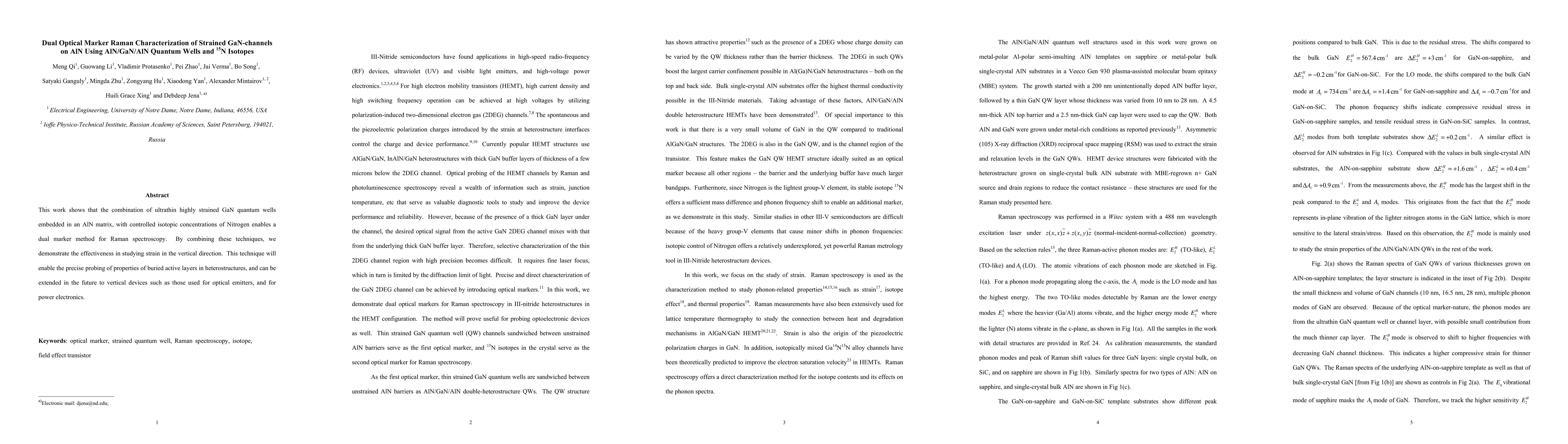 This paper introduces a dual optical marker Raman characterization method using strained GaN-channels on AlN with 15N isotopes, enabling precise vertical strain analysis in quantum well structures. This technique facilitates the study of buried active layers in heterostructures and has potential applications in optical emitters and power electronics.
