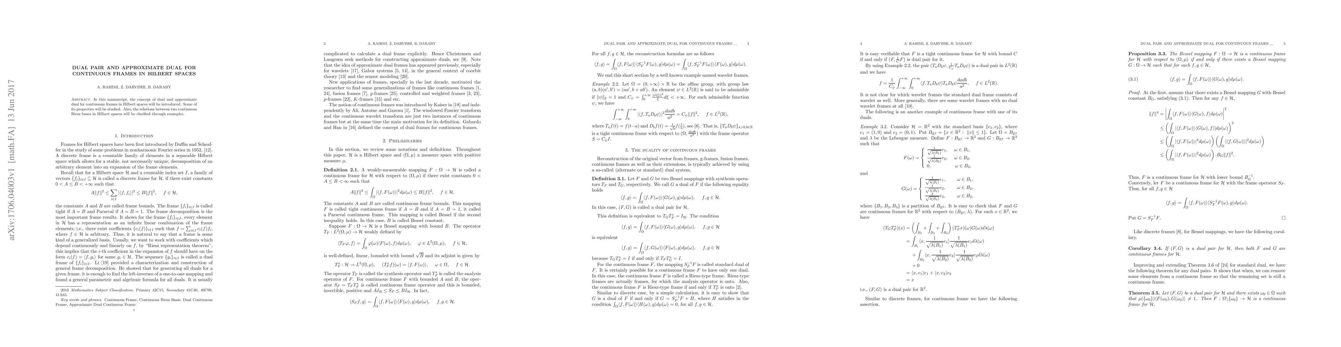 This paper introduces the concepts of dual and approximate dual for continuous frames in Hilbert spaces, explores their properties, and clarifies the relationships between two continuous Riesz bases through illustrative examples.
