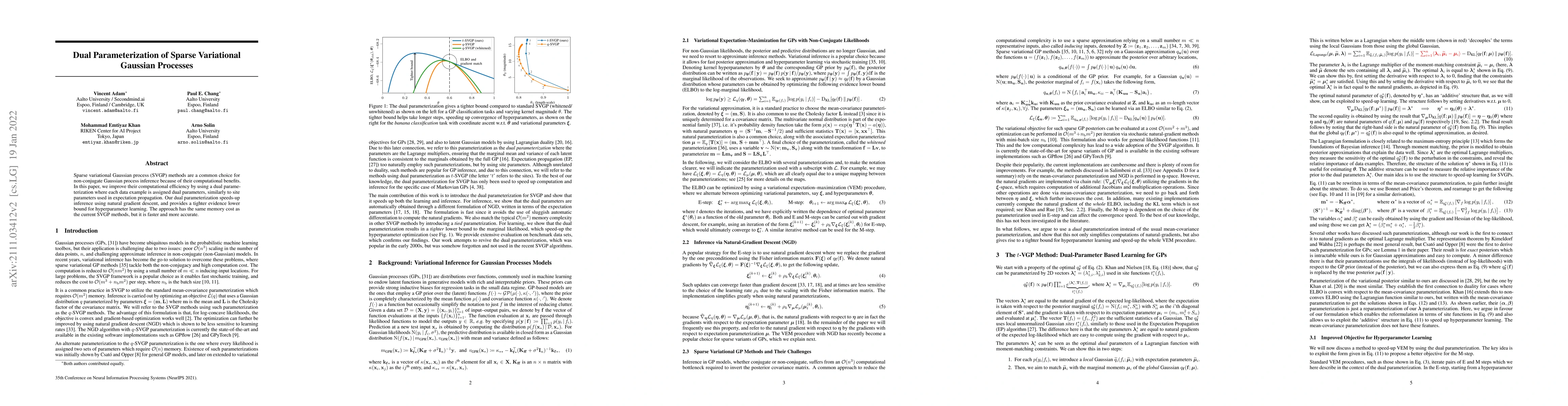 This paper introduces a dual parameterization for sparse variational Gaussian processes (SVGP) to enhance computational efficiency. The method assigns dual parameters to each data example, improving inference speed via natural gradient descent and yielding a tighter evidence lower bound for hyperparameter learning, all while maintaining the same memory cost as existing SVGP methods.