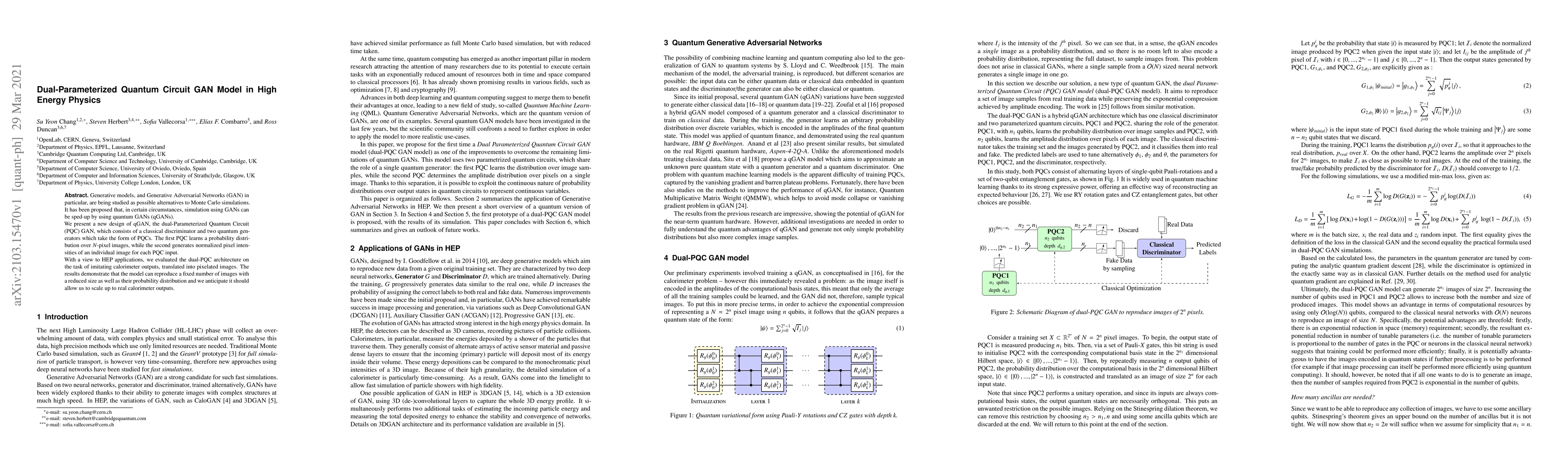 The research introduces a new quantum Generative Adversarial Network (qGAN) model, called dual-Parameterized Quantum Circuit (PQC) GAN, designed for high-energy physics applications. It successfully reproduces calorimeter output images, demonstrating potential for accelerating Monte Carlo simulations in this field.