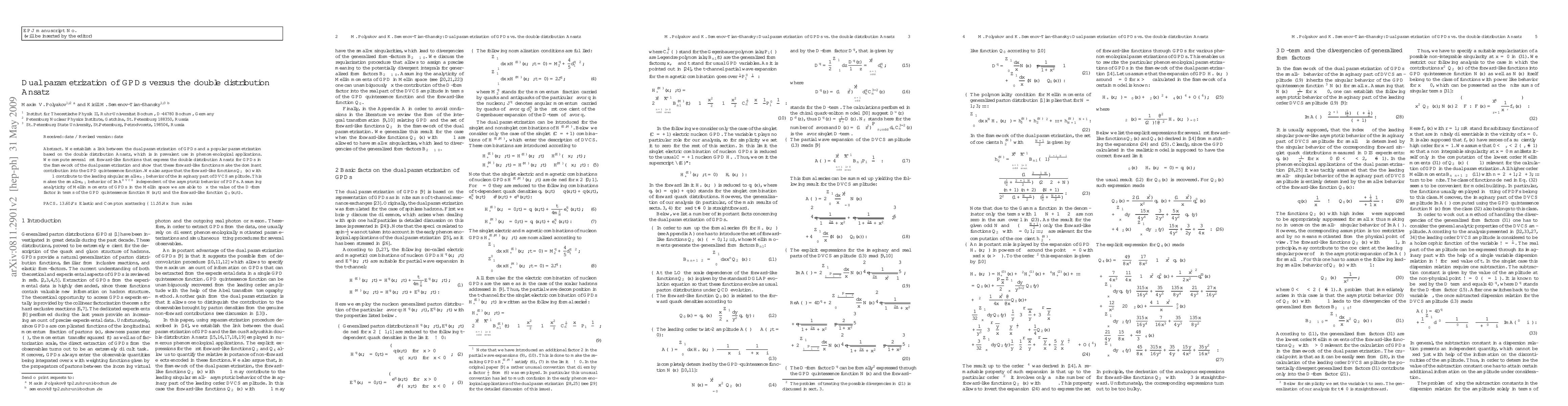 We establish a link between the dual parametrization of GPDs and a popular parametrization based on the double distribution Ansatz, which is in prevalent use in phenomenological applications. We compute several first forward-like functions that express the double distribution Ansatz for GPDs in the framework of the dual parametrization and show that these forward-like functions make the dominant contribution into the GPD quintessence function. We also argue that the forward-like functions $Q_{2 \nu}(x)$ with $\nu \ge 1$ contribute to the leading singular small-$x_{Bj}$ behavior of the imaginary part of DVCS amplitude. This makes the small-$x_{Bj}$ behavior of $\im A^{DVCS}$ independent of the asymptotic behavior of PDFs. Assuming analyticity of Mellin moments of GPDs in the Mellin space we are able to fix the value of the $D$-form factor in terms of the GPD quintessence function $N(x,t)$ and the forward-like function $Q_0(x,t)$.