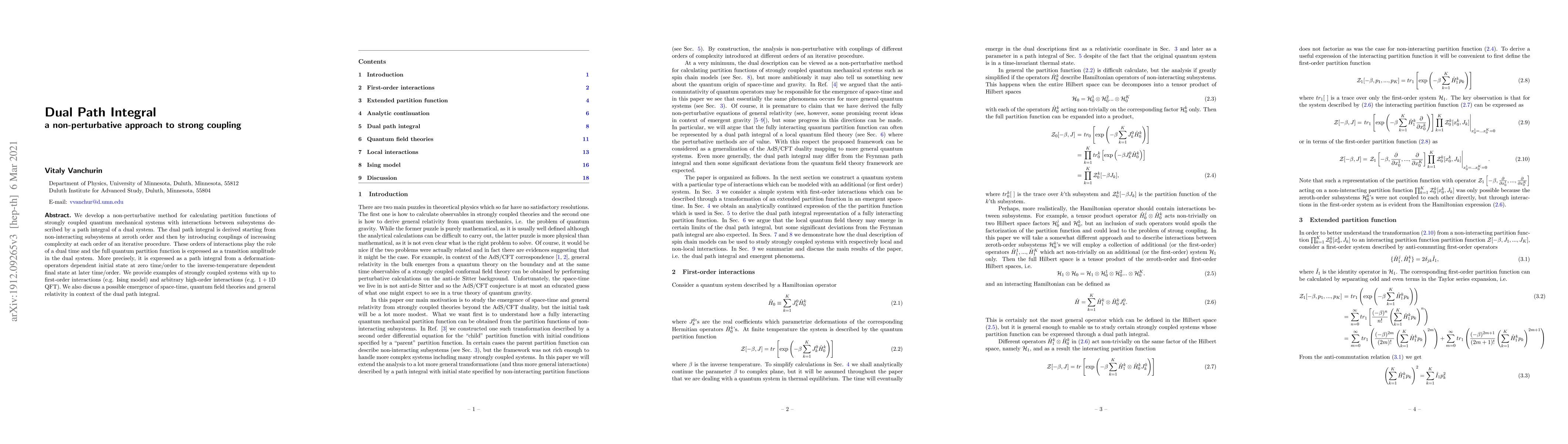 We develop a non-perturbative method for calculating partition functions of strongly coupled quantum mechanical systems with interactions between subsystems described by a path integral of a dual system. The dual path integral is derived starting from non-interacting subsystems at zeroth order and then by introducing couplings of increasing complexity at each order of an iterative procedure. These orders of interactions play the role of a dual time and the full quantum partition function is expressed as a transition amplitude in the dual system. More precisely, it is expressed as a path integral from a deformation-operators dependent initial state at zero time/order to the inverse-temperature dependent final state at later time/order. We provide three examples of strongly coupled systems with first-order, second-order and higher-order interactions and discuss a possible emergence of space-time, quantum field theories and general relativity in context of the dual path integral.