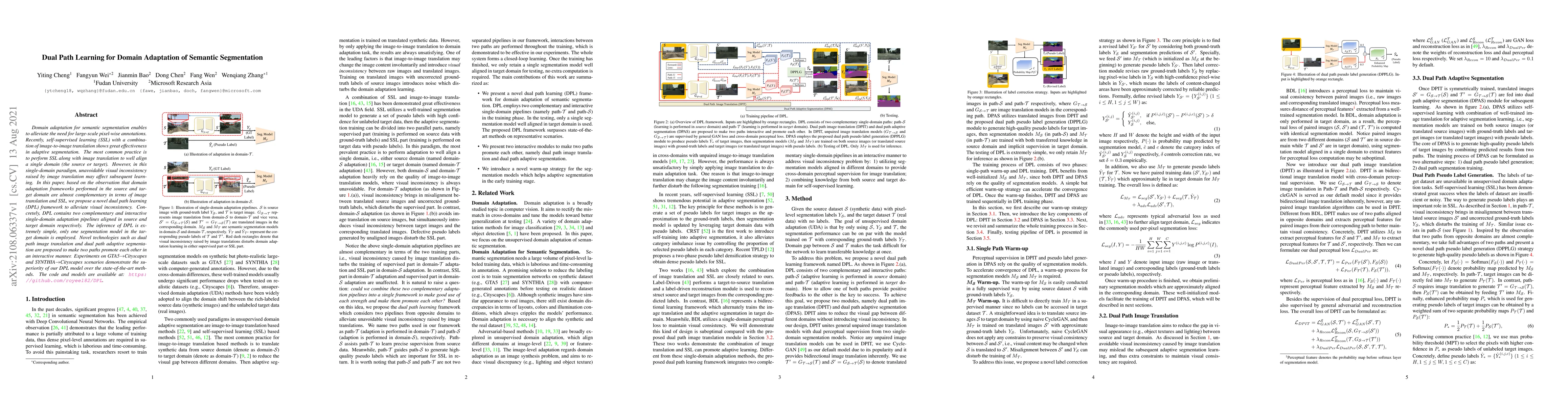 This paper proposes a dual path learning (DPL) framework for domain adaptation in semantic segmentation, aiming to reduce visual inconsistency from image translation. The DPL method employs two complementary single-domain adaptation pipelines, one in each domain, which interact to enhance each other, leading to superior performance compared to state-of-the-art methods.