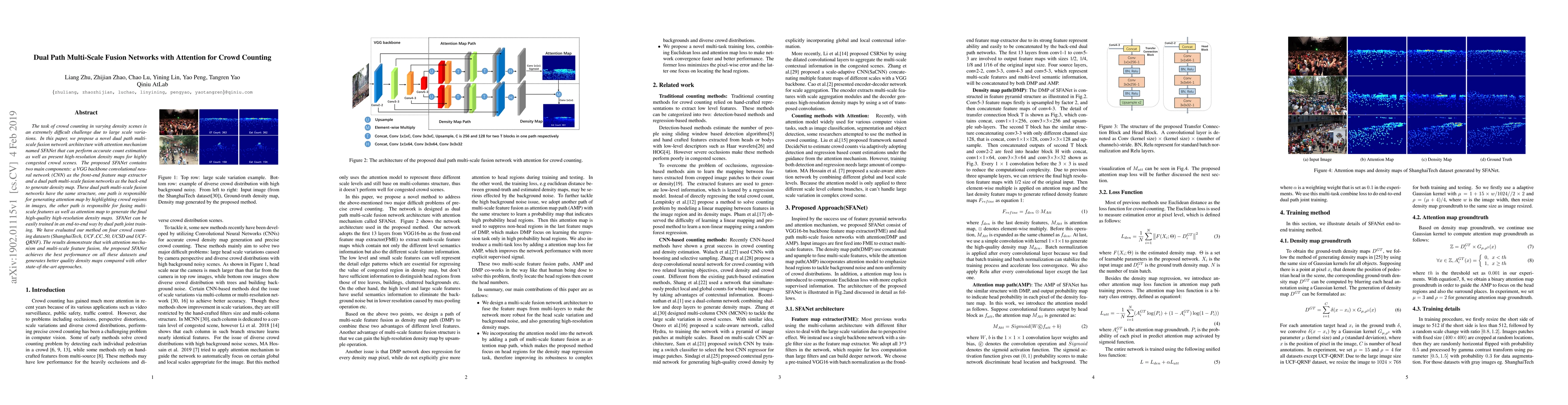 The paper proposes SFANet, a dual path multi-scale fusion network with attention for accurate crowd counting in dense scenes. It combines a VGG backbone and dual path networks to generate high-resolution density maps, achieving superior performance on multiple datasets.