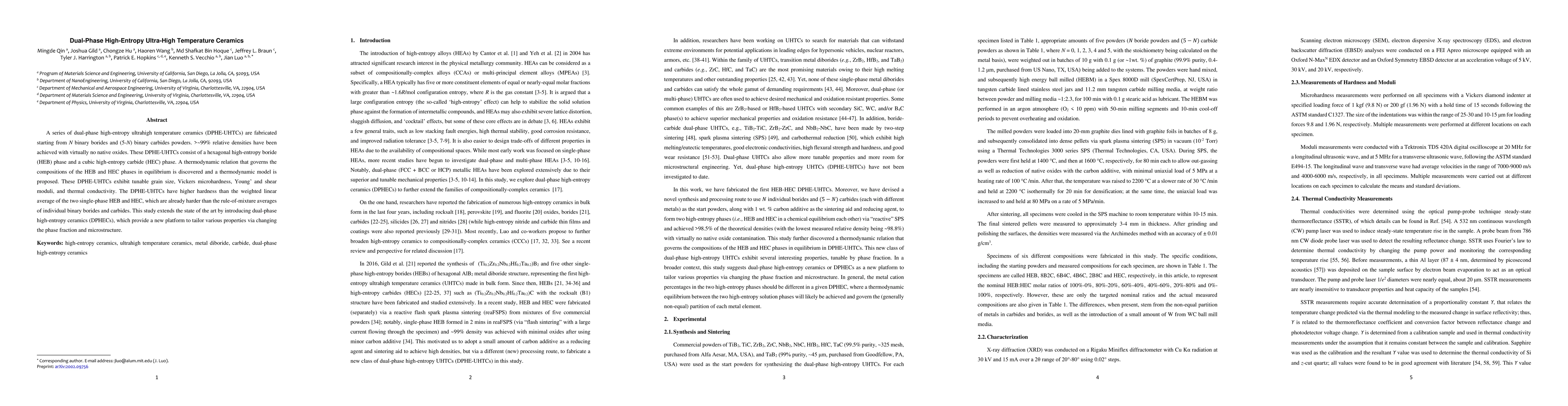 This study fabricates dual-phase high-entropy ultrahigh temperature ceramics (DPHE-UHTCs) with nearly 100% density and minimal oxides, consisting of hexagonal high-entropy boride and cubic high-entropy carbide phases. The materials exhibit enhanced mechanical and thermal properties, surpassing the averages of their constituent phases.