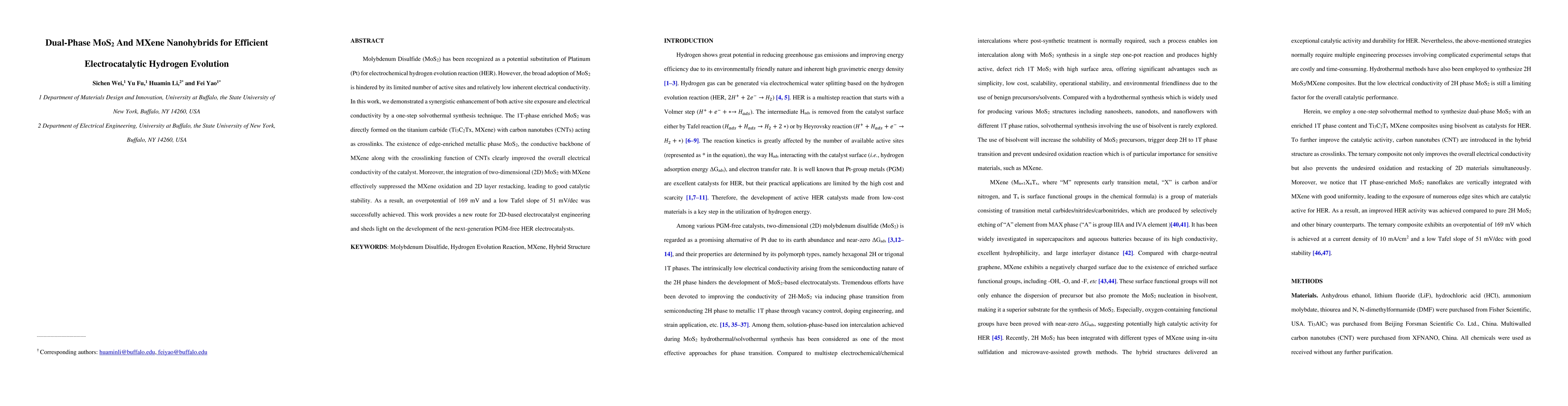 This paper presents a dual-phase MoS$_2$ and MXene nanohybrid synthesized via a solvothermal method to enhance electrocatalytic hydrogen evolution. The integration of 1T-phase MoS$_2$ with MXene and CNTs improves electrical conductivity, active site exposure, and stability, achieving an overpotential of 169 mV and a Tafel slope of 51 mV/dec, indicating potential for next-generation PGM-free HER catalysts.