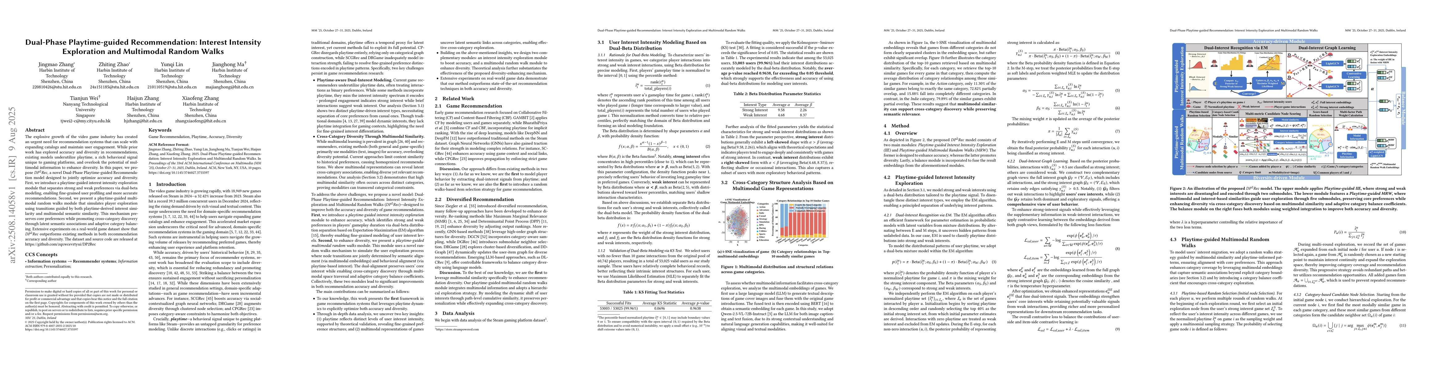 The explosive growth of the video game industry has created an urgent need for recommendation systems that can scale with expanding catalogs and maintain user engagement. While prior work has explored accuracy and diversity in recommendations, existing models underutilize playtime, a rich behavioral signal unique to gaming platforms, and overlook the potential of multimodal information to enhance diversity. In this paper, we propose DP2Rec, a novel Dual-Phase Playtime-guided Recommendation model designed to jointly optimize accuracy and diversity. First, we introduce a playtime-guided interest intensity exploration module that separates strong and weak preferences via dual-beta modeling, enabling fine-grained user profiling and more accurate recommendations. Second, we present a playtime-guided multimodal random walks module that simulates player exploration using transitions guided by both playtime-derived interest similarity and multimodal semantic similarity. This mechanism preserves core preferences while promoting cross-category discovery through latent semantic associations and adaptive category balancing. Extensive experiments on a real-world game dataset show that DP2Rec outperforms existing methods in both recommendation accuracy and diversity.