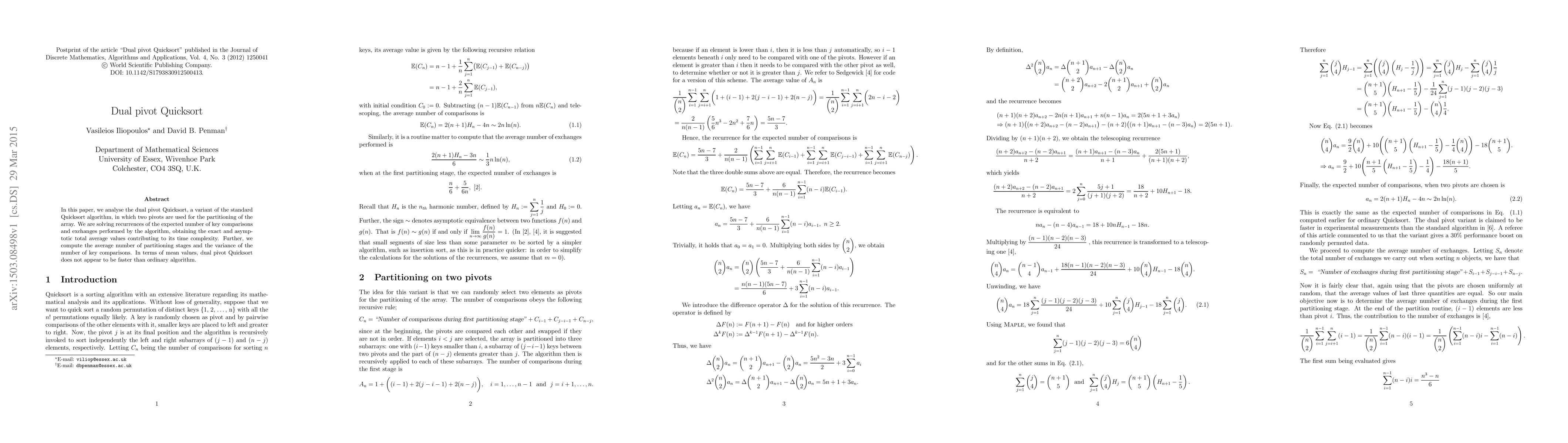 Dual pivot Quicksort uses two pivots for array partitioning, and this paper analyzes its expected number of comparisons and exchanges. While it does not show a mean time complexity advantage over standard Quicksort, it provides insights into its average partitioning stages and variance in comparisons.