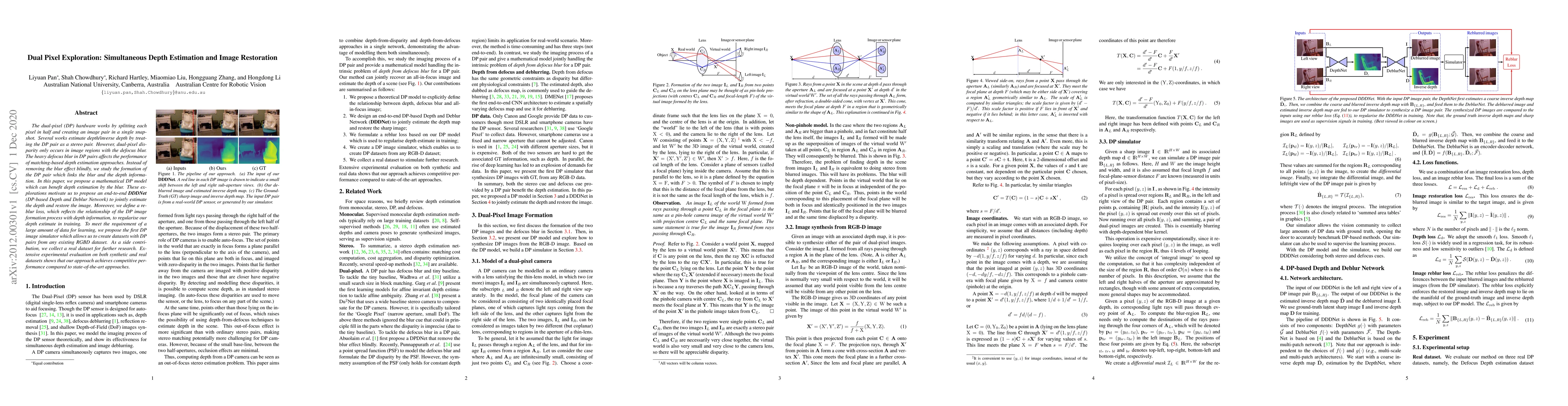 This paper proposes a mathematical model for dual-pixel imaging to simultaneously estimate depth and restore deblurred images, introducing DDDNet and a reblur loss function. It also develops a DP image simulator for dataset creation and reports competitive performance on synthetic and real datasets.