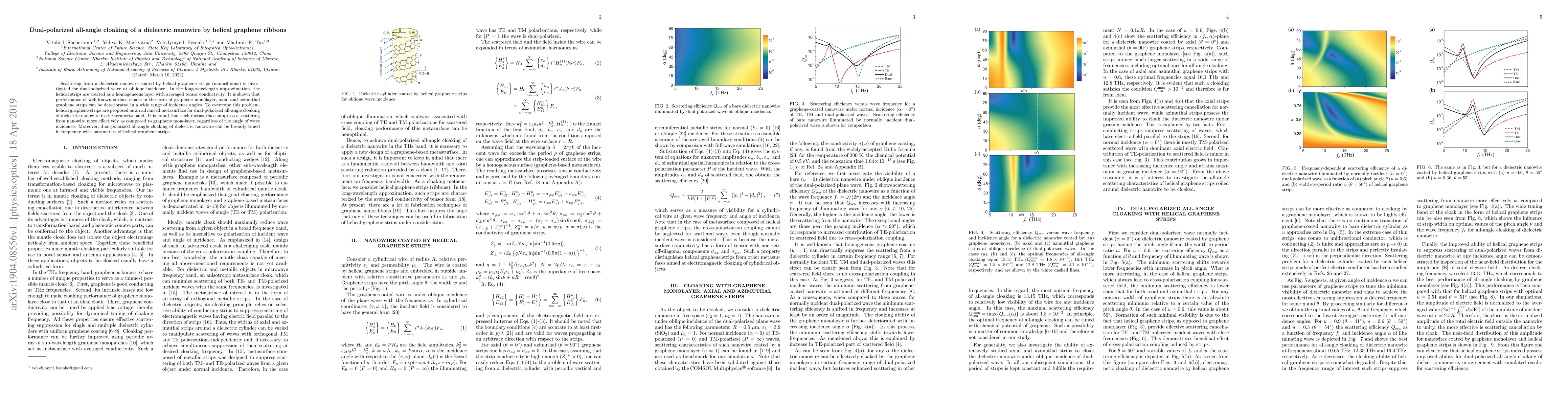 This paper investigates the dual-polarized scattering of a dielectric nanowire coated by helical graphene strips, demonstrating that helical graphene ribbons provide superior all-angle cloaking compared to traditional graphene structures, effectively suppressing scattering across a wide range of angles and tunable frequencies in the terahertz band.
