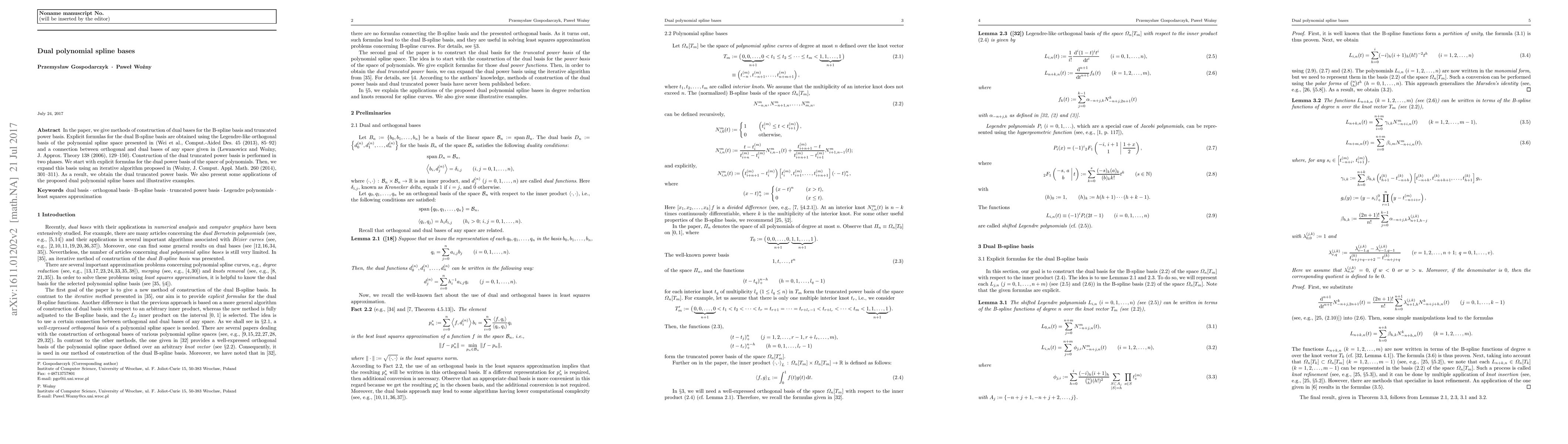 This paper constructs dual bases for B-spline and truncated power bases using explicit formulas and iterative algorithms, leveraging connections between orthogonal and dual bases. Applications and examples are also provided to demonstrate the utility of the proposed dual polynomial spline bases.