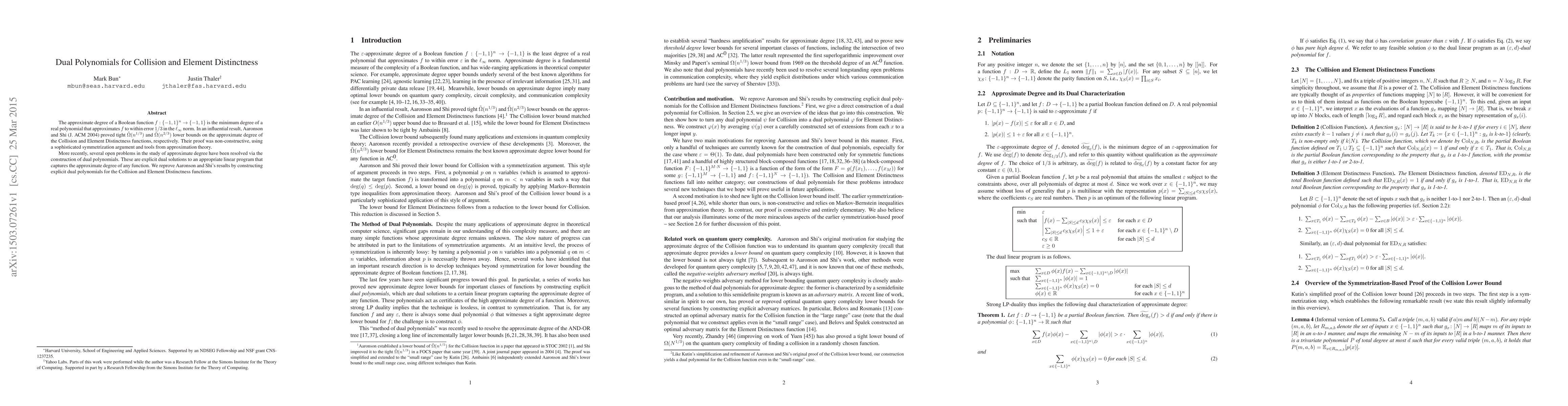 This paper constructs explicit dual polynomials to reprove Aaronson and Shi's results on the approximate degree of the Collision and Element Distinctness functions, providing a constructive solution to their previously non-constructive proofs.