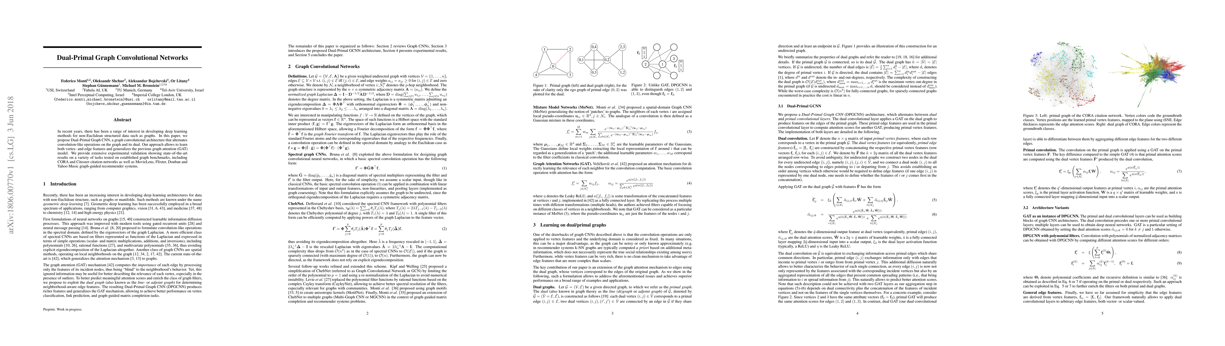 The paper proposes Dual-Primal Graph CNN, a novel graph convolutional network that alternates between convolution operations on the graph and its dual to learn both vertex and edge features. The method outperforms previous graph attention models and achieves state-of-the-art results on various graph benchmarks.