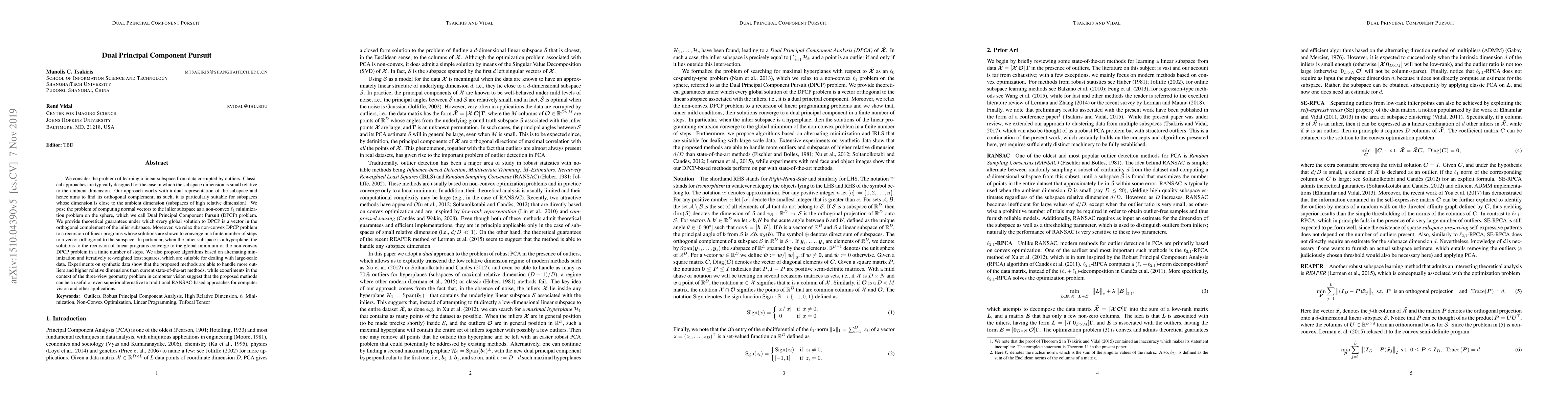 We consider the problem of learning a linear subspace from data corrupted by outliers. Classical approaches are typically designed for the case in which the subspace dimension is small relative to the ambient dimension. Our approach works with a dual representation of the subspace and hence aims to find its orthogonal complement; as such, it is particularly suitable for subspaces whose dimension is close to the ambient dimension (subspaces of high relative dimension). We pose the problem of computing normal vectors to the inlier subspace as a non-convex $\ell_1$ minimization problem on the sphere, which we call Dual Principal Component Pursuit (DPCP) problem. We provide theoretical guarantees under which every global solution to DPCP is a vector in the orthogonal complement of the inlier subspace. Moreover, we relax the non-convex DPCP problem to a recursion of linear programs whose solutions are shown to converge in a finite number of steps to a vector orthogonal to the subspace. In particular, when the inlier subspace is a hyperplane, the solutions to the recursion of linear programs converge to the global minimum of the non-convex DPCP problem in a finite number of steps. We also propose algorithms based on alternating minimization and iteratively re-weighted least squares, which are suitable for dealing with large-scale data. Experiments on synthetic data show that the proposed methods are able to handle more outliers and higher relative dimensions than current state-of-the-art methods, while experiments in the context of the three-view geometry problem in computer vision suggest that the proposed methods can be a useful or even superior alternative to traditional RANSAC-based approaches for computer vision and other applications.