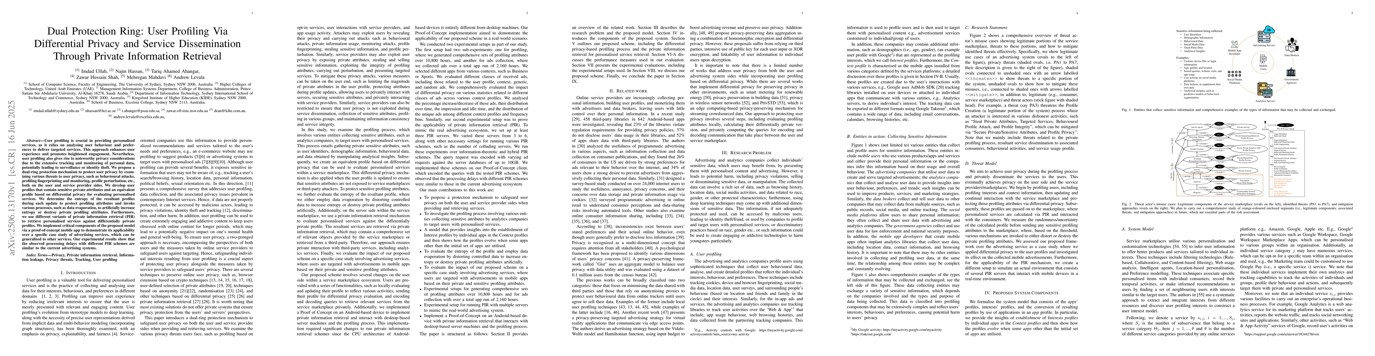 User profiling is crucial in providing personalised services, as it relies on analysing user behaviour and preferences to deliver targeted services. This approach enhances user experience and promotes heightened engagement. Nevertheless, user profiling also gives rise to noteworthy privacy considerations due to the extensive tracking and monitoring of personal data, potentially leading to surveillance or identity theft. We propose a dual-ring protection mechanism to protect user privacy by examining various threats to user privacy, such as behavioural attacks, profiling fingerprinting and monitoring, profile perturbation, etc., both on the user and service provider sides. We develop user profiles that contain sensitive private attributes and an equivalent profile based on differential privacy for evaluating personalised services. We determine the entropy of the resultant profiles during each update to protect profiling attributes and invoke various processes, such as data evaporation, to artificially increase entropy or destroy private profiling attributes. Furthermore, we use different variants of private information retrieval (PIR) to retrieve personalised services against differentially private profiles. We implement critical components of the proposed model via a proof-of-concept mobile app to demonstrate its applicability over a specific case study of advertising services, which can be generalised to other services. Our experimental results show that the observed processing delays with different PIR schemes are similar to the current advertising systems.