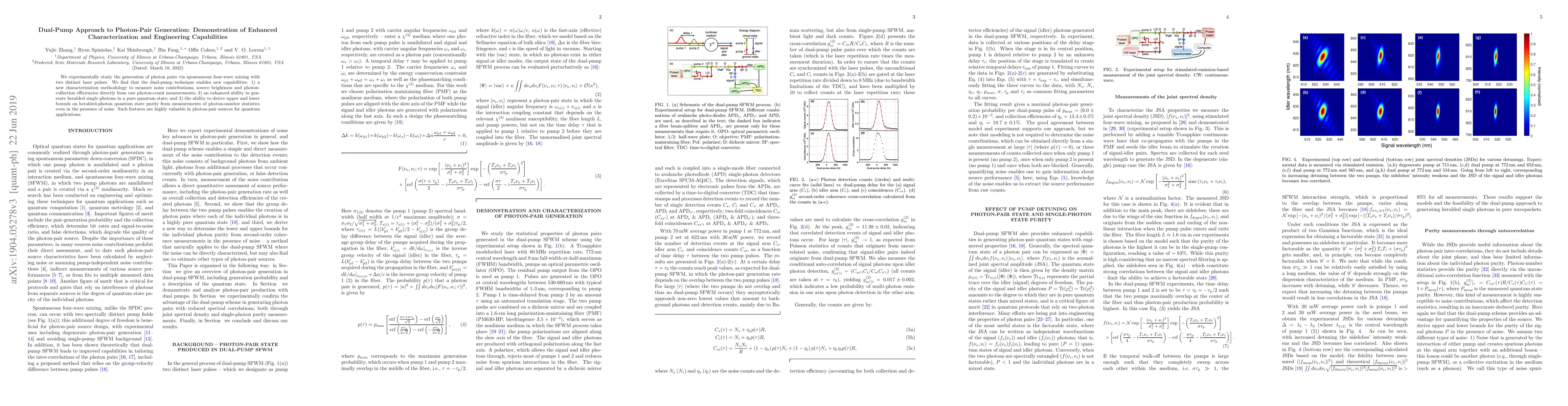 We experimentally study the generation of photon pairs via spontaneous four-wave mixing with two distinct laser pulses. We find that the dual-pump technique enables new capabilities: 1) a new characterization methodology to measure noise contributions, source brightness and photon collection efficiencies directly from raw photon-count measurements; 2) an enhanced ability to generate heralded single photons in a pure quantum state; and 3) the ability to derive upper and lower bounds on heralded-photon quantum state purity from measurements of photon-number statistics even in the presence of noise. Such features are highly valuable in photon-pair sources for quantum applications.