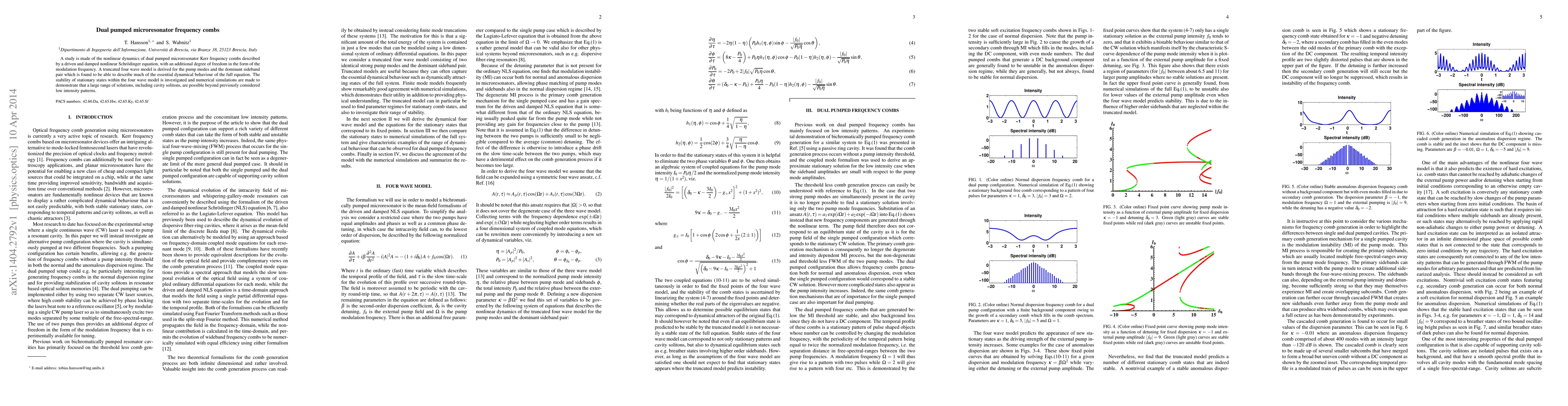A study is made of the nonlinear dynamics of dual pumped microresonator Kerr frequency combs described by a driven and damped nonlinear Schr\"odinger equation, with an additional degree of freedom in the form of the modulation frequency. A truncated four wave model is derived for the pump modes and the dominant sideband pair which is found to be able to describe much of the essential dynamical behaviour of the full equation. The stability of stationary states within the four wave model is investigated and numerical simulations are made to demonstrate that a large range of solutions, including cavity solitons, are possible beyond previously considered low intensity patterns.