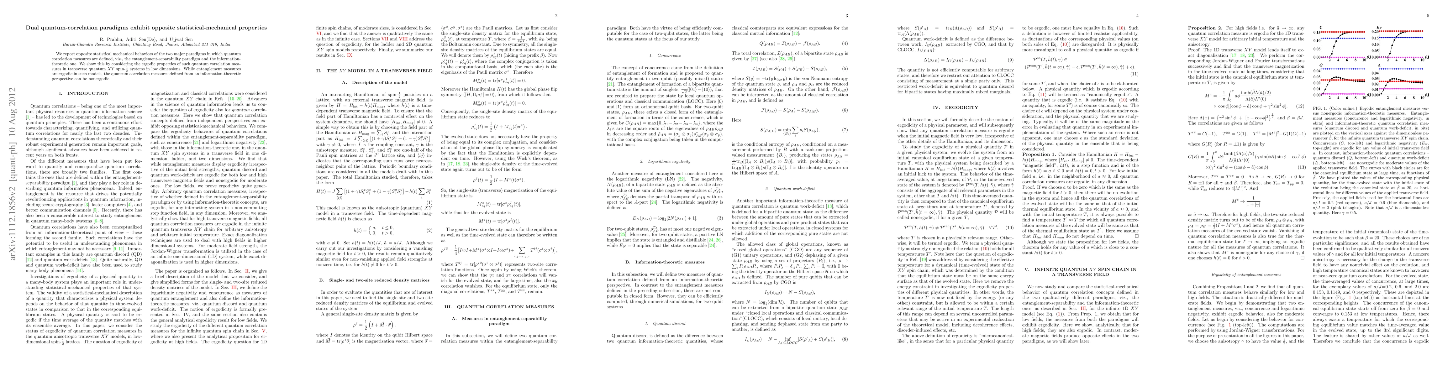 This paper investigates the contrasting statistical mechanical behaviors of quantum correlation paradigms, revealing that entanglement-based measures are ergodic in low-dimensional quantum XY spin-1/2 systems, whereas information-theoretic measures can exhibit nonergodic properties.