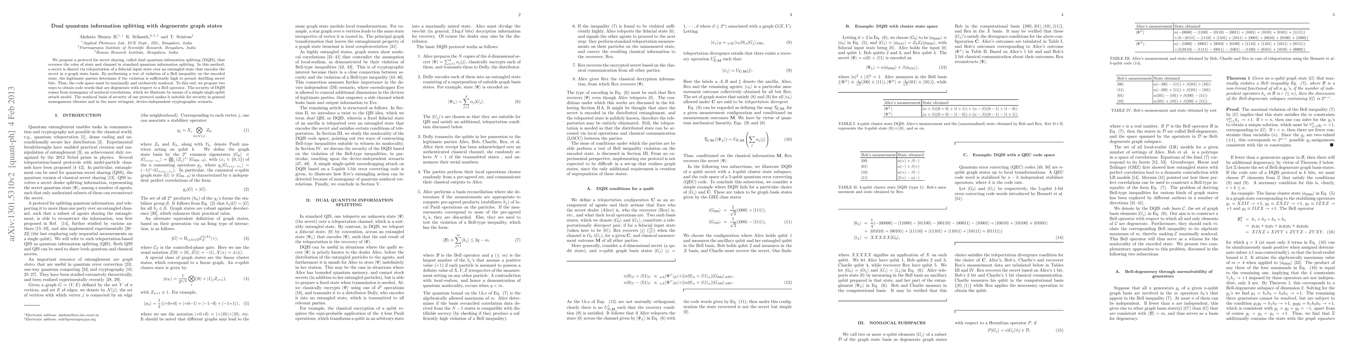 This paper proposes a dual quantum information splitting protocol for secret sharing that uses entangled graph states to share secrets securely. The security relies on the nonlocal nature of the graph states and the monogamy of nonlocal correlations, making it robust against single-qubit attacks and suitable for device-independent cryptography.