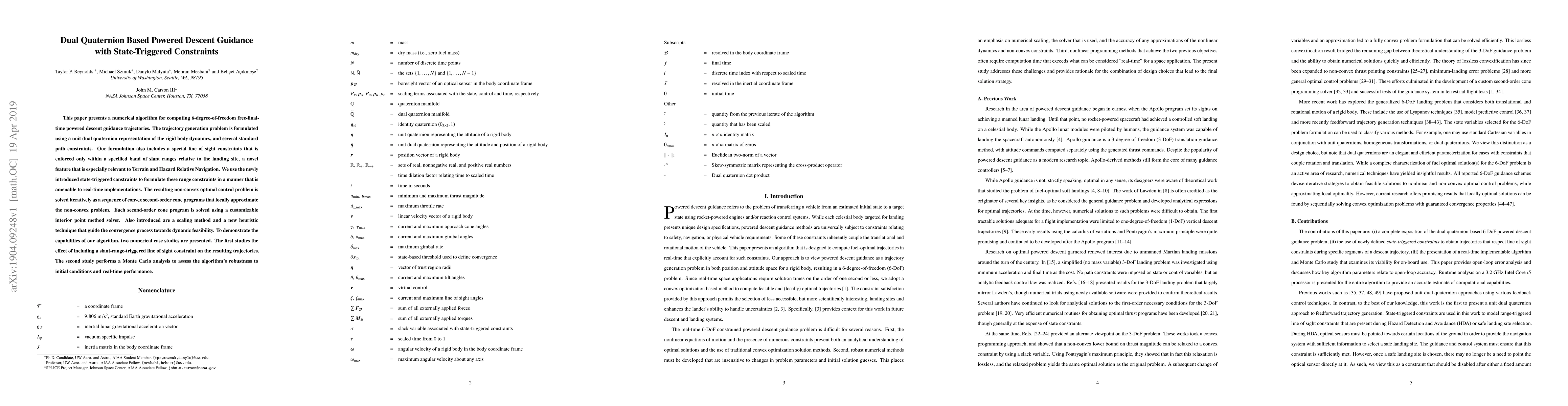 This paper proposes a dual quaternion-based algorithm for generating 6-DOF powered descent trajectories with state-triggered constraints, including a novel slant-range-triggered line of sight constraint for Terrain and Hazard Relative Navigation. The non-convex optimal control problem is solved iteratively via convex second-order cone programs, demonstrating robustness and performance through numerical case studies.