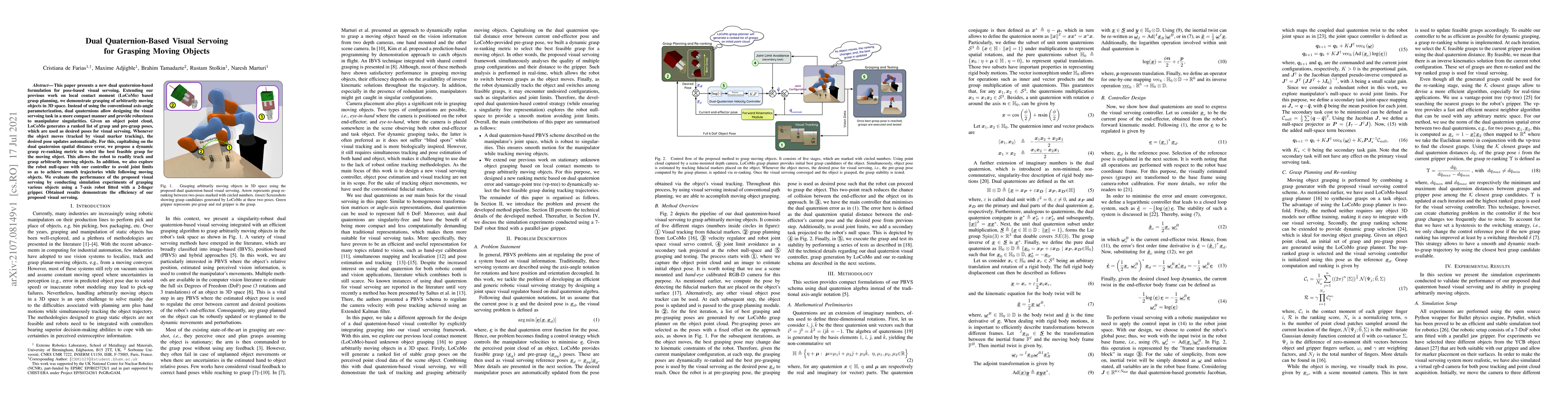 This paper introduces a dual quaternion-based visual servoing method for grasping moving objects, enhancing robustness and singularity avoidance. The method dynamically updates grasp poses based on object movement and employs a re-ranking metric for optimal grasp selection, validated through simulation on a 7-axis robot.