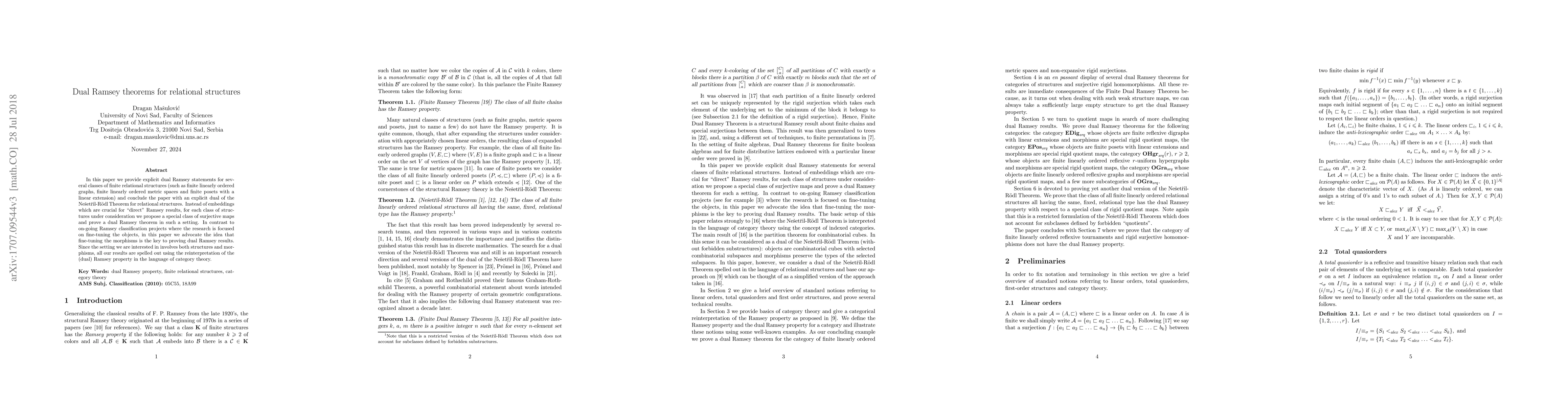 This paper presents explicit dual Ramsey theorems for various classes of finite relational structures, emphasizing the use of surjective maps instead of embeddings. It concludes with a dual version of the Nešetřil-Rödl Theorem, arguing that fine-tuning morphisms is crucial for proving dual Ramsey results, all framed within category theory.