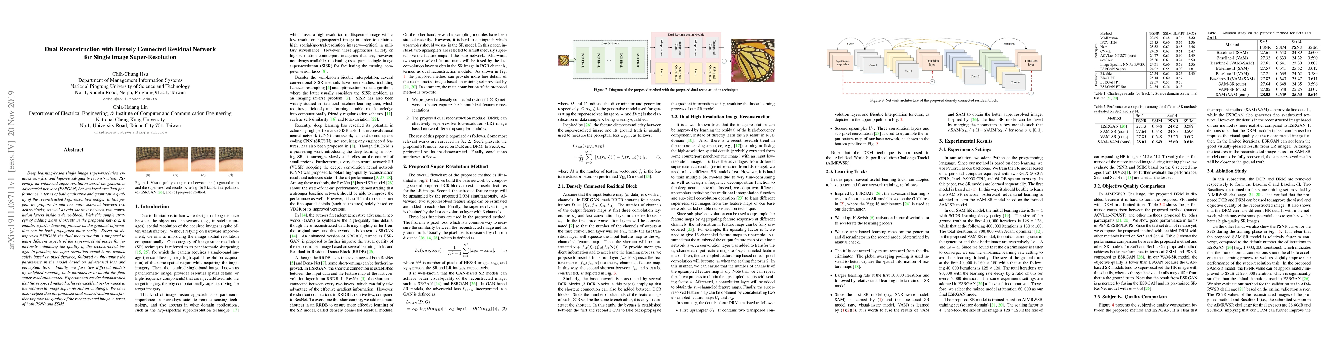 Deep learning-based single image super-resolution enables very fast and high-visual-quality reconstruction. Recently, an enhanced super-resolution based on generative adversarial network (ESRGAN) has achieved excellent performance in terms of both qualitative and quantitative quality of the reconstructed high-resolution image. In this paper, we propose to add one more shortcut between two dense-blocks, as well as add shortcut between two convolution layers inside a dense-block. With this simple strategy of adding more shortcuts in the proposed network, it enables a faster learning process as the gradient information can be back-propagated more easily. Based on the improved ESRGAN, the dual reconstruction is proposed to learn different aspects of the super-resolved image for judiciously enhancing the quality of the reconstructed image. In practice, the super-resolution model is pre-trained solely based on pixel distance, followed by fine-tuning the parameters in the model based on adversarial loss and perceptual loss. Finally, we fuse two different models by weighted-summing their parameters to obtain the final super-resolution model. Experimental results demonstrated that the proposed method achieves excellent performance in the real-world image super-resolution challenge. We have also verified that the proposed dual reconstruction does further improve the quality of the reconstructed image in terms of both PSNR and SSIM.