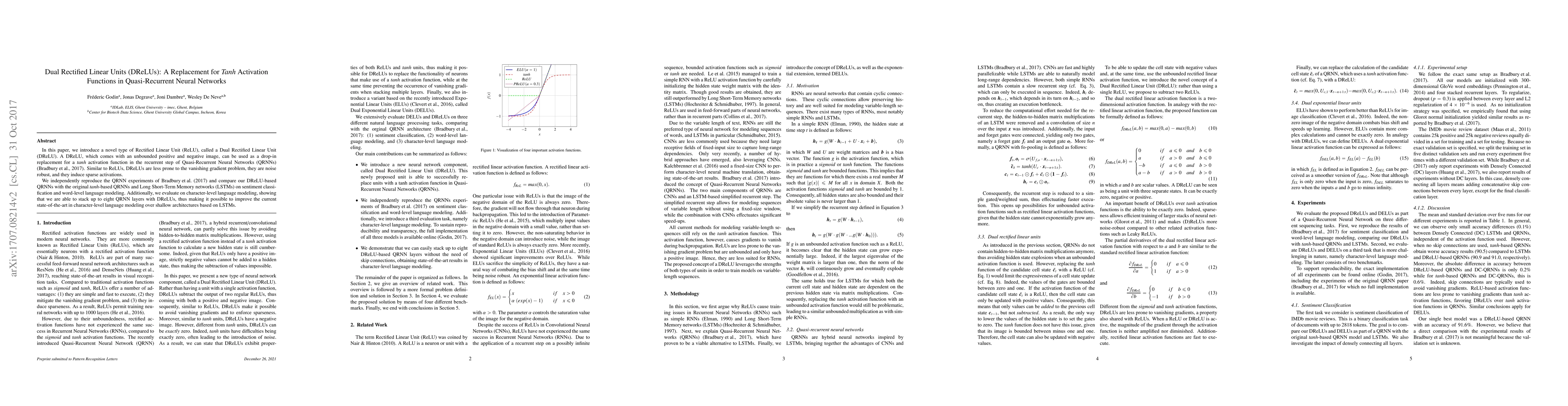 In this paper, we introduce a novel type of Rectified Linear Unit (ReLU), called a Dual Rectified Linear Unit (DReLU). A DReLU, which comes with an unbounded positive and negative image, can be used as a drop-in replacement for a tanh activation function in the recurrent step of Quasi-Recurrent Neural Networks (QRNNs) (Bradbury et al. (2017)). Similar to ReLUs, DReLUs are less prone to the vanishing gradient problem, they are noise robust, and they induce sparse activations. We independently reproduce the QRNN experiments of Bradbury et al. (2017) and compare our DReLU-based QRNNs with the original tanh-based QRNNs and Long Short-Term Memory networks (LSTMs) on sentiment classification and word-level language modeling. Additionally, we evaluate on character-level language modeling, showing that we are able to stack up to eight QRNN layers with DReLUs, thus making it possible to improve the current state-of-the-art in character-level language modeling over shallow architectures based on LSTMs.
