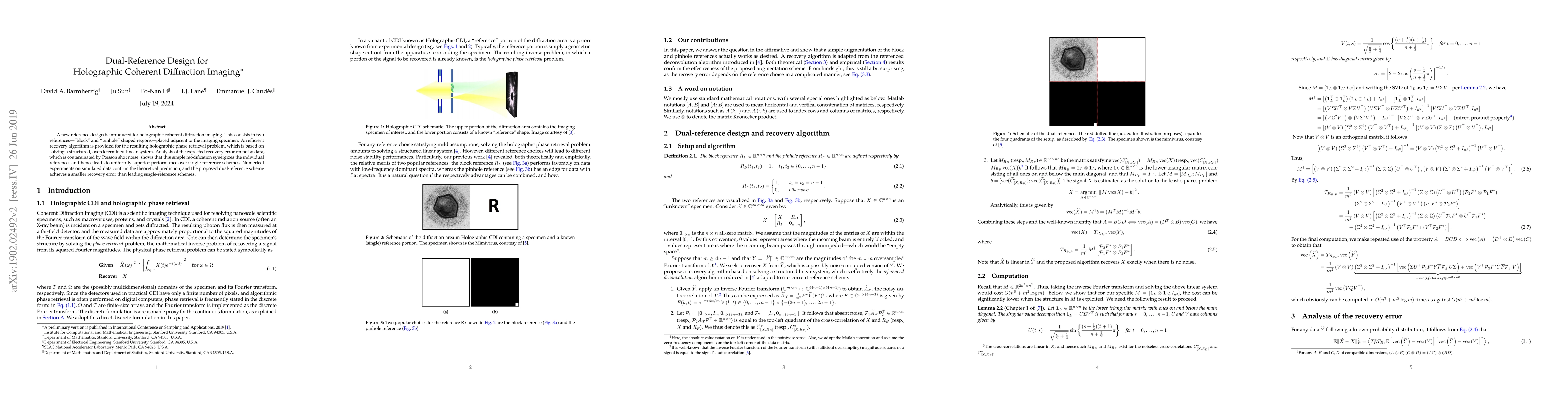This paper introduces a dual-reference design for holographic coherent diffraction imaging using "block" and "pinhole" shaped regions, which synergizes their individual references for superior performance. An efficient recovery algorithm based on solving a structured, overdetermined linear system is provided, showing reduced recovery error compared to single-reference schemes, confirmed by numerical experiments on simulated data.