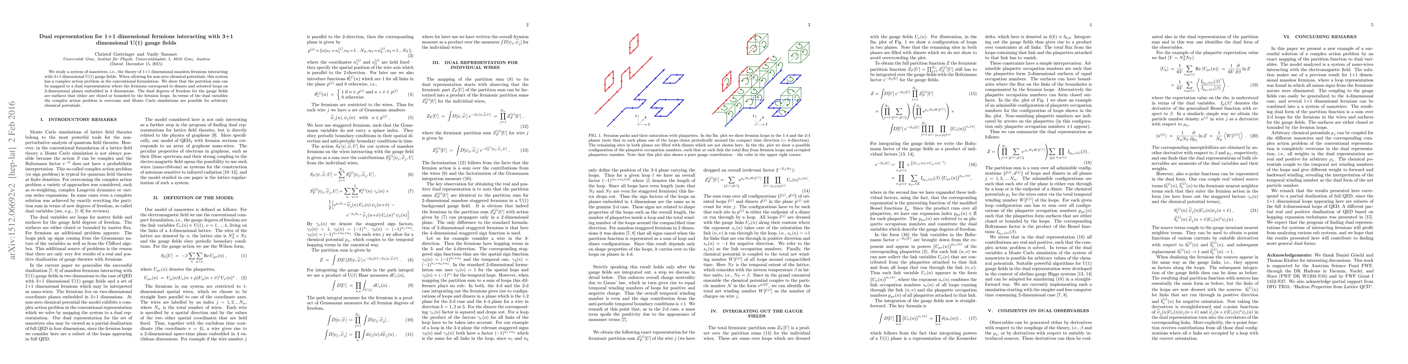 We study a system of nanowires, i.e., the theory of 1+1 dimensional massless fermions interacting with 3+1 dimensional U(1) gauge fields. When allowing for non-zero chemical potentials, this system has a complex action problem in the conventional formulation. We show that the partition sum can be mapped to a dual representation where the fermions correspond to dimers and oriented loops on 2-dimensional planes embedded in 4 dimensions. The dual degrees of freedom for the gauge fields are surfaces that either are closed or bounded by the fermion loops. In terms of the dual variables the complex action problem is overcome and Monte Carlo simulations are possible for arbitrary chemical potentials.