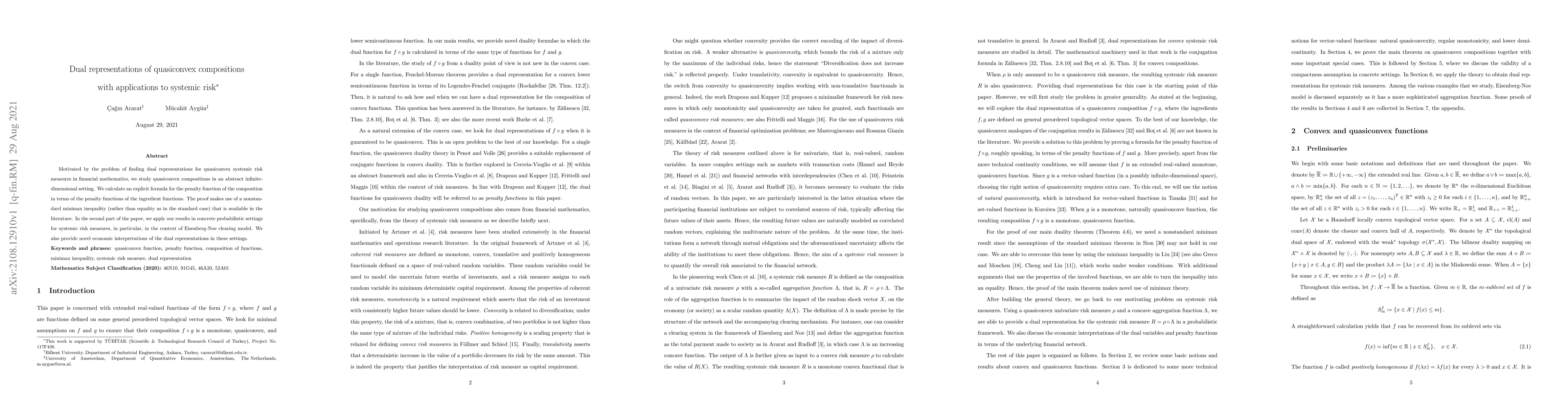 Motivated by the problem of finding dual representations for quasiconvex systemic risk measures in financial mathematics, we study quasiconvex compositions in an abstract infinite-dimensional setting. We calculate an explicit formula for the penalty function of the composition in terms of the penalty functions of the ingredient functions. The proof makes use of a nonstandard minimax inequality (rather than equality as in the standard case) that is available in the literature. In the second part of the paper, we apply our results in concrete probabilistic settings for systemic risk measures, in particular, in the context of Eisenberg-Noe clearing model. We also provide novel economic interpretations of the dual representations in these settings.