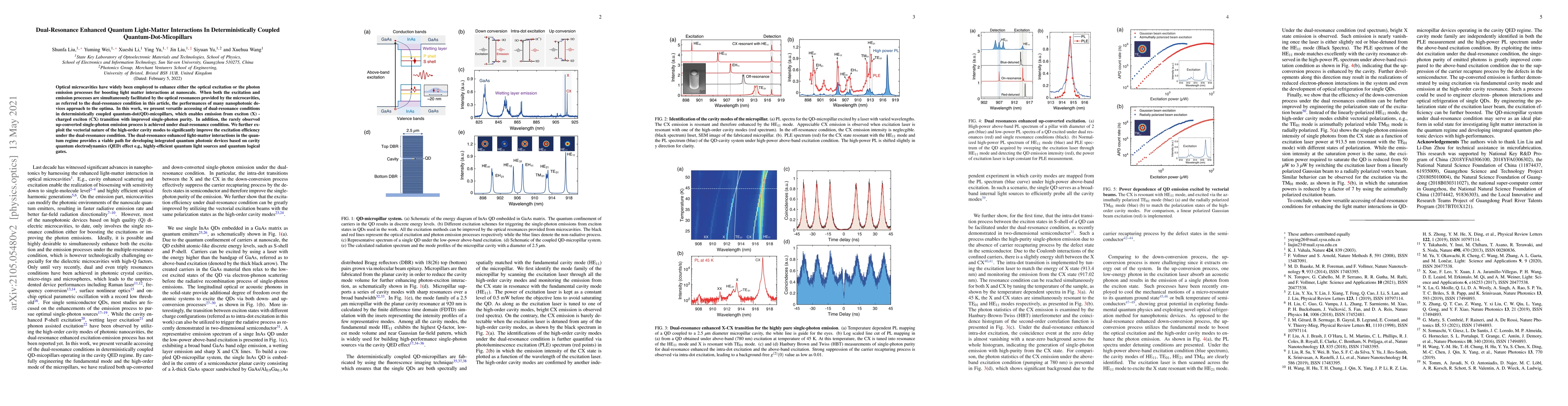 Optical microcavities have widely been employed to enhance either the optical excitation or the photon emission processes for boosting light matter interactions at nanoscale. When both the excitation and emission processes are simultaneously facilitated by the optical resonances provided by the microcavities, as referred to the dual-resonance condition in this article, the performances of many nanophotonic devices approach to the optima. In this work, we present versatile accessing of dual-resonance conditions in deterministically coupled quantum-dot(QD)-micopillars, which enables emission from exciton (X) - charged exciton (CX) transition with improved single-photon purity. In addition, the rarely observed up-converted single-photon emission process is achieved under dual-resonance condition. We further exploit the vectorial nature of the high-order cavity modes to significantly improve the excitation efficiency under the dual-resonance condition. The dual-resonance enhanced light-matter interactions in the quantum regime provides a viable path for developing integrated quantum photonic devices based on cavity quantum electrodynamics (QED) effect e.g., highly-efficient quantum light sources and quantum logical gates.