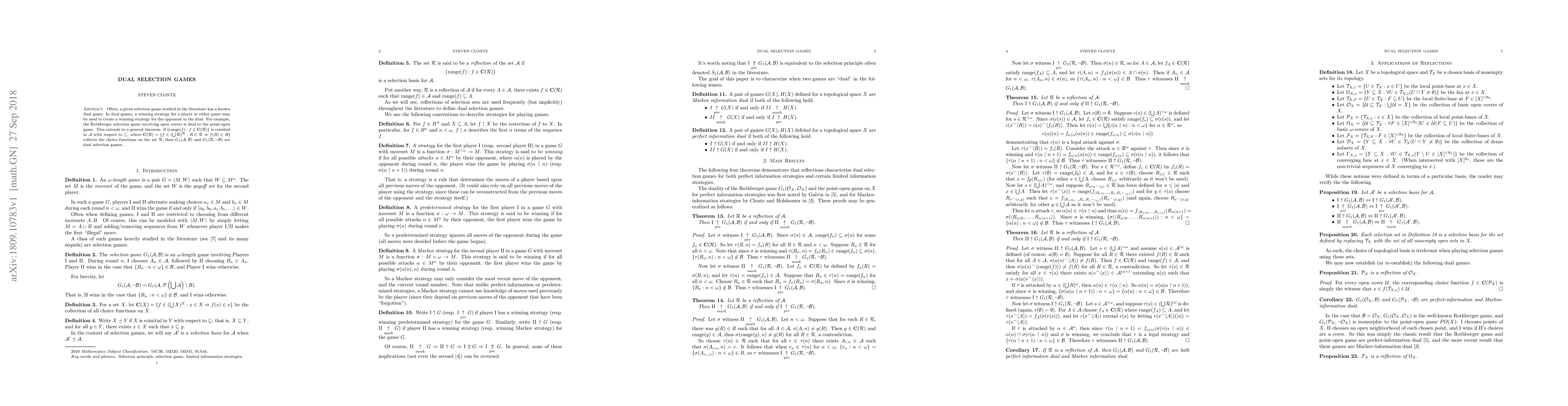 Often, a given selection game studied in the literature has a known dual game. In dual games, a winning strategy for a player in either game may be used to create a winning strategy for the opponent in the dual. For example, the Rothberger selection game involving open covers is dual to the point-open game. This extends to a general theorem: if $\{\operatorname{ran}{f}:f\in\mathbf C(\mathcal R)\}$ is coinitial in $\mathcal A$ with respect to $\subseteq$, where $\mathbf C(\mathcal R)=\{f\in(\bigcup\mathcal R)^{\mathcal R}:R\in\mathcal R\Rightarrow f(R)\in R\}$ collects the choice functions on the set $\mathcal R$, then $G_1(\mathcal A,\mathcal B)$ and $G_1(\mathcal R,\neg\mathcal B)$ are dual selection games.