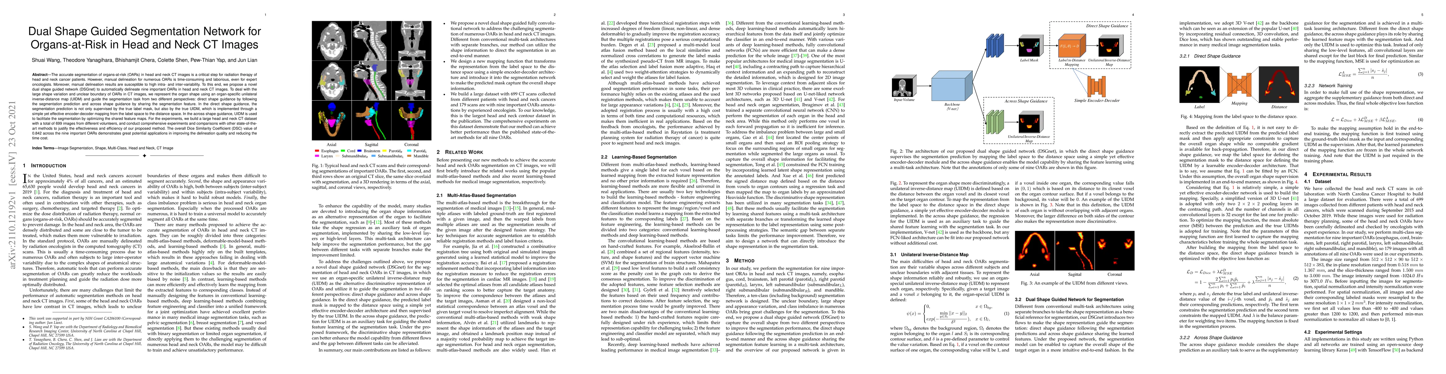 The paper proposes a dual shape guided segmentation network (DSGnet) to automatically delineate nine organs-at-risk in head and neck CT images, using an organ-specific unilateral inverse-distance map (UIDM) to handle shape variation and unclear boundaries. The method achieves an overall Dice Similarity Coefficient of 0.842, demonstrating improved delineation quality and efficiency compared to manual delineation.