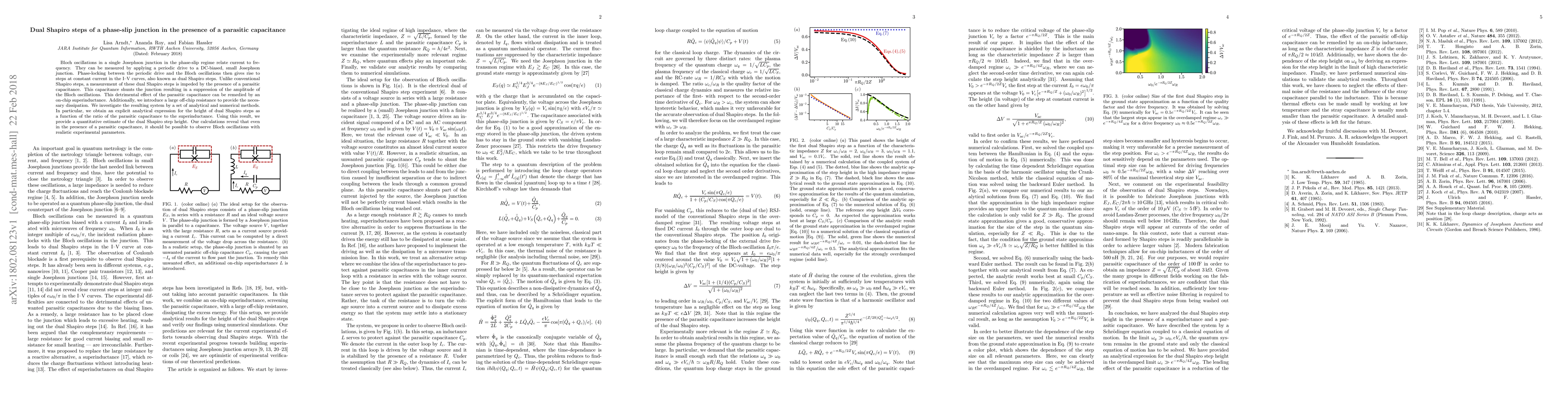 This paper investigates dual Shapiro steps in phase-slip junctions affected by parasitic capacitance, showing that parasitic capacitance suppresses Bloch oscillations. The authors propose using on-chip superinductance and off-chip resistance to mitigate this effect, providing an analytical expression for the height of dual Shapiro steps and demonstrating that observable Bloch oscillations remain feasible under realistic conditions.