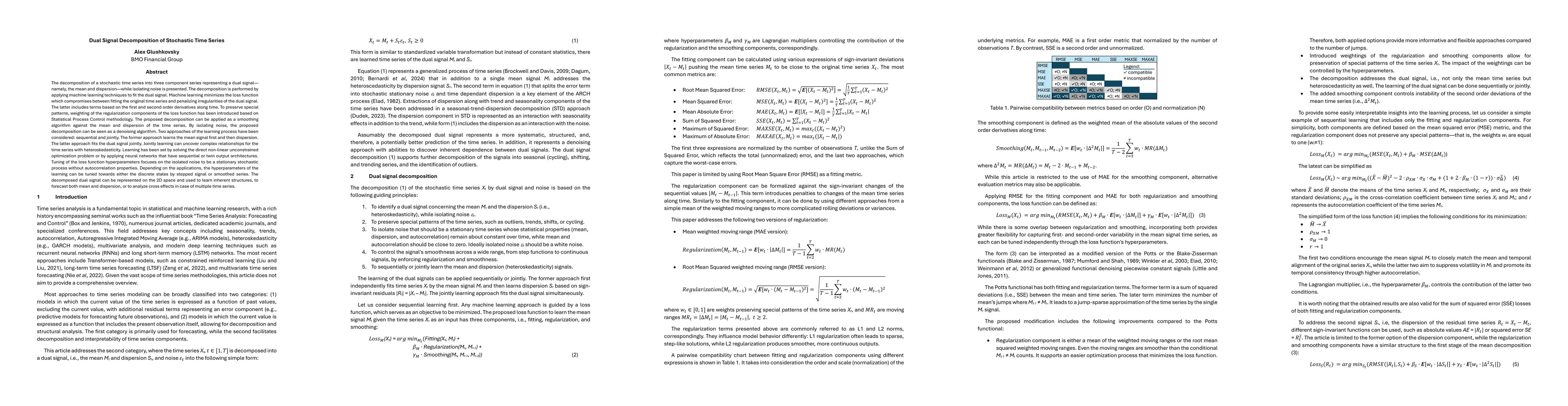 The research paper addresses decomposition of a stochastic time series into three time series representing a dual signal i.e., the mean and the dispersion, with noise isolated. Decomposition is done by applying machine learning to fit a dual signal. Machine learning minimizes the loss function which compromises between fitting the original time series and penalizing irregularities of the dual signal. The latter includes terms based on the first and second order derivatives along time. To preserve special patterns, weighting of the regularization components of the loss function has been introduced based on Statistical Process Control methodology. The proposed decomposition can be applied as a smoothing algorithm against the mean and dispersion of the time series. By isolating noise, the proposed decomposition can be seen as a denoising algorithm. Two approaches of the learning process have been considered: sequential and jointly. The former approach learns the mean signal first and then dispersion. The latter approach fits the dual signal jointly. Jointly learning can uncover complex relationships for the time series with heteroskedasticity. Learning has been set by solving the direct non-linear unconstrained optimization problem or by applying neural networks that have sequential or twin output architectures. Tuning of the loss function hyperparameters focuses on the isolated noise to be a stationary stochastic process without autocorrelation properties. Depending on the applications, the hyperparameters of the learning can be tuned towards either the discrete states by stepped signal or smoothed series. The decomposed dual signal can be represented on the 2D space and used to learn inherent structures, to forecast both mean and dispersion, or to analyze cross effects in case of multiple time series.