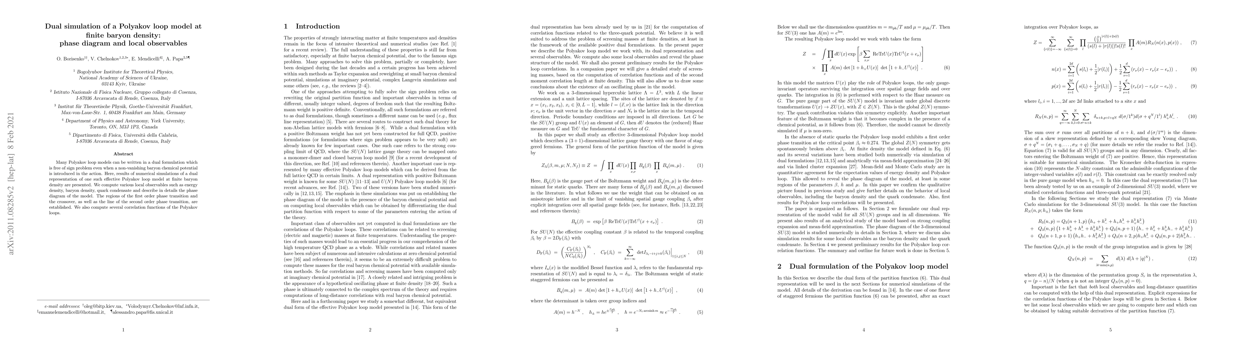 This paper presents numerical simulations of a dual Polyakov loop model at finite baryon density, revealing the phase diagram and local observables like energy density and quark condensate. It identifies regions of first-order phase transitions, crossovers, and a second-order phase transition line, alongside correlation functions of Polyakov loops.