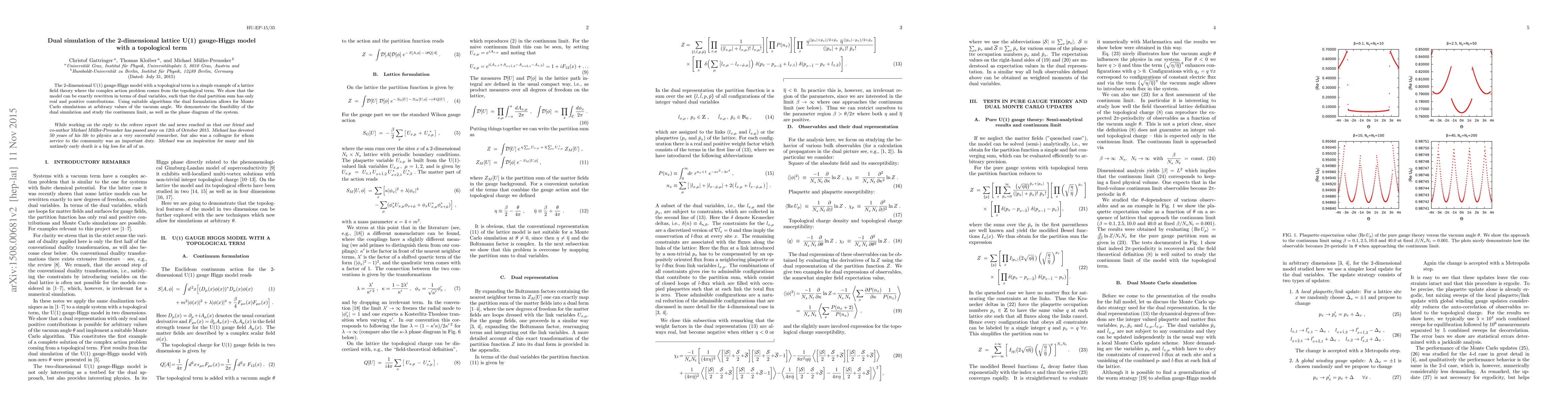 This paper presents an exact dual formulation of the 2-dimensional U(1) gauge-Higgs model with a topological term, enabling Monte Carlo simulations with real and positive contributions. The study demonstrates the dual simulation's feasibility and explores the continuum limit and phase diagram.