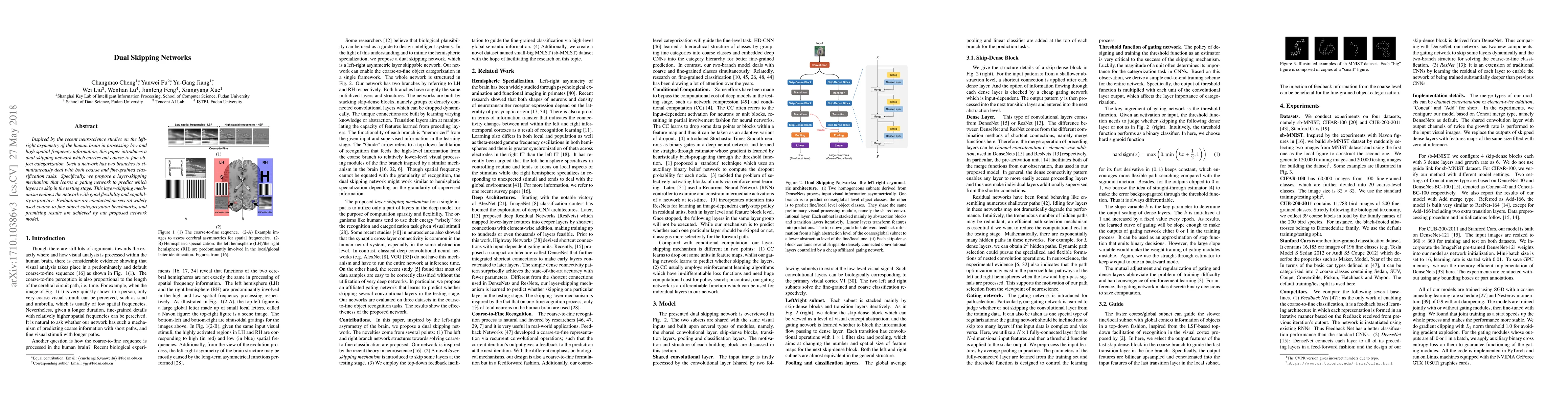 A new neural network architecture called Dual Skipping Networks is proposed to categorize objects with low and high spatial frequencies. It achieves promising results on widely used benchmarks by dynamically skipping layers in testing.