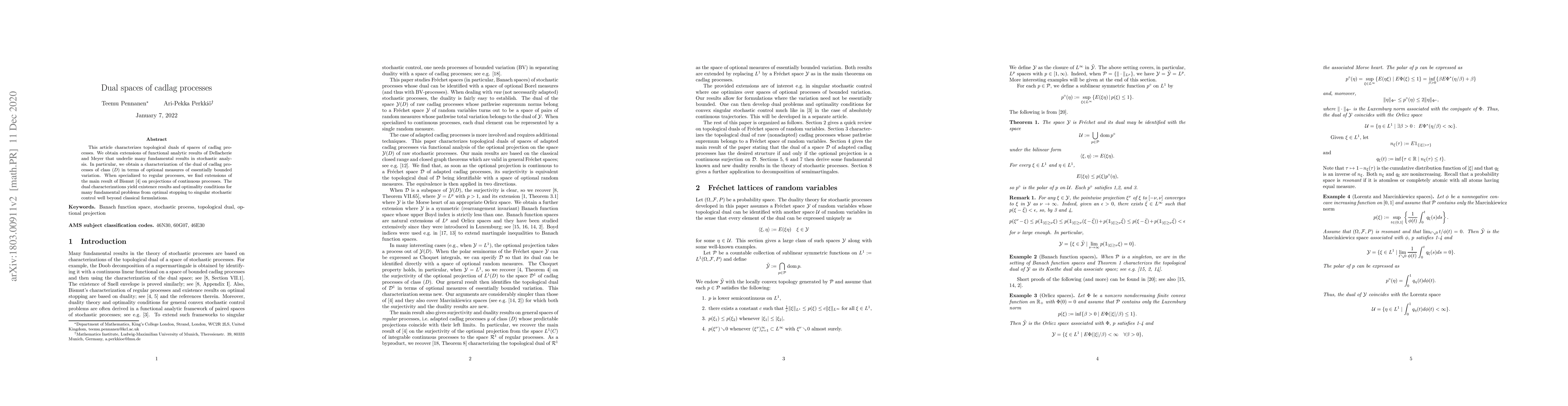 This paper characterizes the topological duals of spaces of cadlag processes, extending functional analytic results of Dellacherie and Meyer. It provides a dual characterization of cadlag processes of class $(D)$ in terms of optional measures of essentially bounded variation, yielding existence and optimality results for optimal stopping and singular stochastic control.