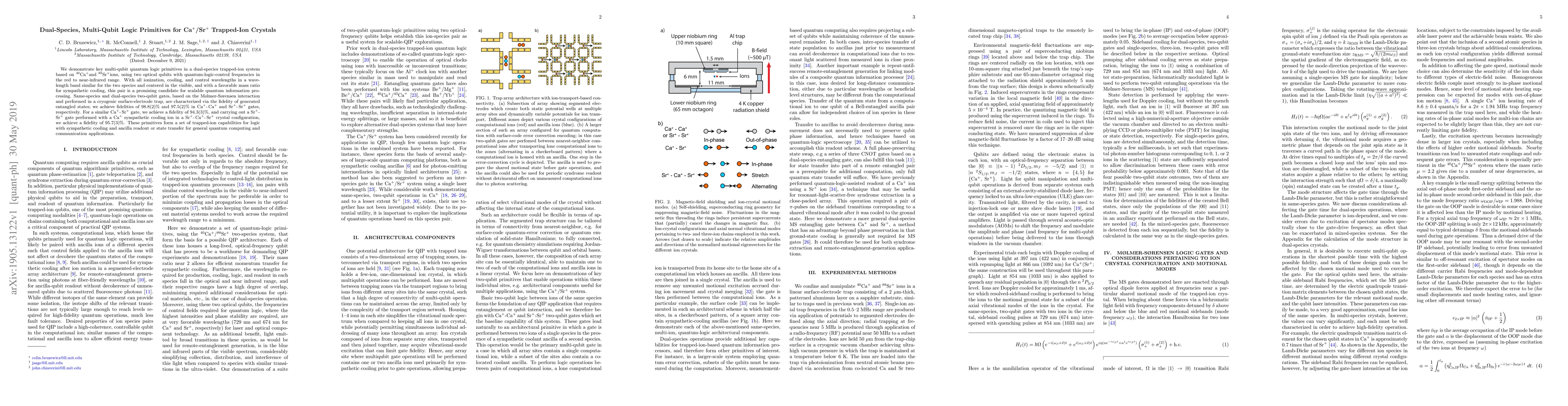 We demonstrate key multi-qubit quantum logic primitives in a dual-species trapped-ion system based on $^{40}$Ca+ and $^{88}$Sr+ ions, using two optical qubits with quantum-logic-control frequencies in the red to near-infrared range. With all ionization, cooling, and control wavelengths in a wavelength band similar for the two species and centered in the visible, and with a favorable mass ratio for sympathetic cooling, this pair is a promising candidate for scalable quantum information processing. Same-species and dual-species two-qubit gates, based on the Moelmer-Soerensen interaction and performed in a cryogenic surface-electrode trap, are characterized via the fidelity of generated entangled states; we achieve fidelities of 98.8(2)% and 97.5(2)% in Ca+ - Ca+ and Sr+ - Sr+ gates, respectively. For a similar Ca+ - Sr+ gate, we achieve a fidelity of 94.3(3)%, and carrying out a Sr+ - Sr+ gate performed with a Ca+ sympathetic cooling ion in a Sr+ - Ca+ - Sr+ crystal configuration, we achieve a fidelity of 95.7(3)%. These primitives form a set of trapped-ion capabilities for logic with sympathetic cooling and ancilla readout or state transfer for general quantum computing and communication applications.