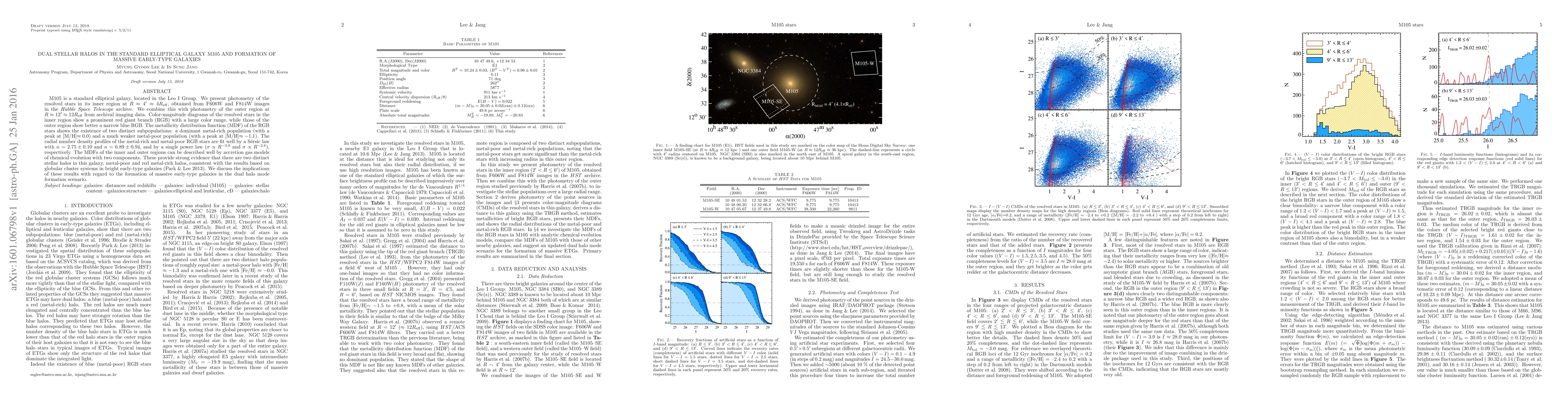 M105 is a standard elliptical galaxy, located in the Leo I Group. We present photometry of the resolved stars in its inner region at R ~ 4' ~ 4Reff, obtained from F606W and F814W images in the Hubble Space Telescope archive. We combine this with photometry of the outer region at R ~ 12' ~ 12Reff from archival imaging data. Color-magnitude diagrams of the resolved stars in the inner region show a prominent red giant branch (RGB) with a large color range, while those of the outer region show better a narrow blue RGB. The metallicity distribution function (MDF) of the RGB stars shows the existence of two distinct subpopulations: a dominant metal-rich population (with a peak at [M/H] ~ 0.0) and a much weaker metal-poor population (with a peak at [M/H] ~ -1.1). The radial number density profiles of the metal-rich and metal-poor RGB stars are fit well by a Sersic law with n=2.75+-0.10 and n=6.89+-0.94, and by a single power law, respectively. The MDFs of the inner and outer regions can be described well by accretion gas models of chemical evolution with two components. These provide strong evidence that there are two distinct stellar halos in this galaxy, metal-poor and red metal-rich halos, consistent with the results based on globular cluster systems in bright early-type galaxies (Park & Lee 2013). We discuss the implications of these results with regard to the formation of massive early-type galaxies in the dual halo mode formation scenario.