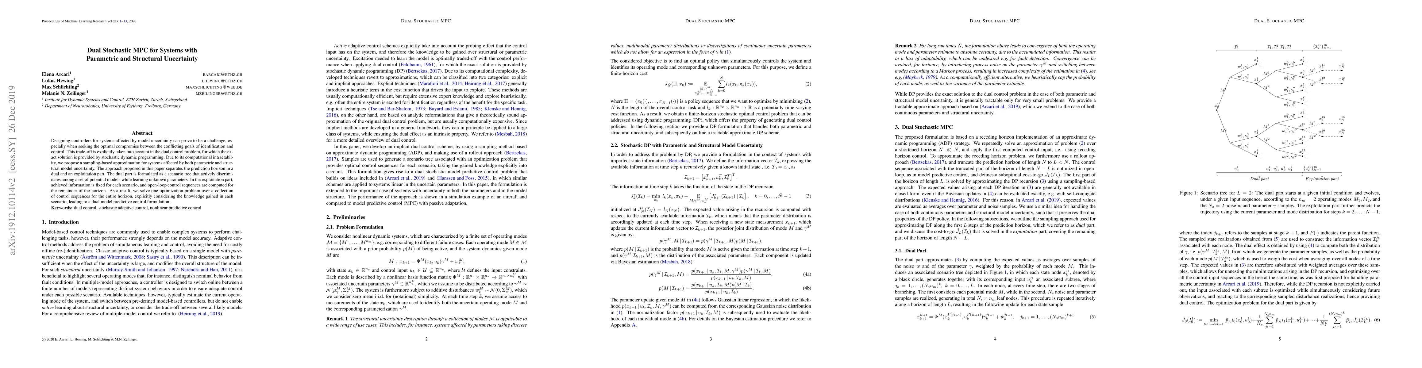 This paper proposes a dual stochastic model predictive control (MPC) approach for systems with parametric and structural uncertainty, addressing the challenge of optimal control amidst model identification. The method divides the prediction horizon into a dual part for active model discrimination and parameter learning, and an exploitation part for fixed-information open-loop control, resulting in an optimized control sequence that considers knowledge gained from scenarios.