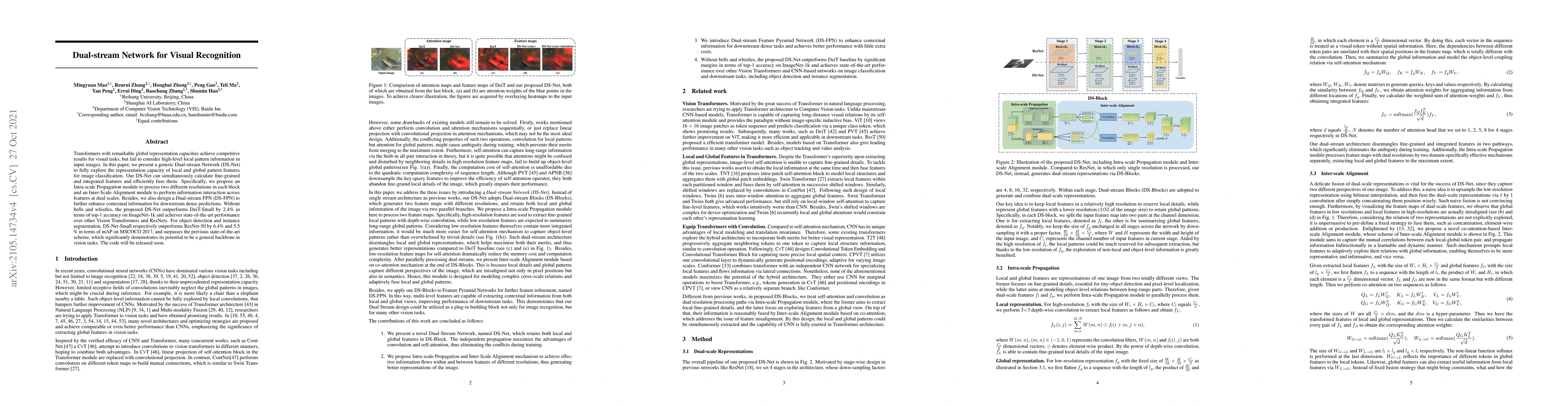 Transformers with remarkable global representation capacities achieve competitive results for visual tasks, but fail to consider high-level local pattern information in input images. In this paper, we present a generic Dual-stream Network (DS-Net) to fully explore the representation capacity of local and global pattern features for image classification. Our DS-Net can simultaneously calculate fine-grained and integrated features and efficiently fuse them. Specifically, we propose an Intra-scale Propagation module to process two different resolutions in each block and an Inter-Scale Alignment module to perform information interaction across features at dual scales. Besides, we also design a Dual-stream FPN (DS-FPN) to further enhance contextual information for downstream dense predictions. Without bells and whistles, the proposed DS-Net outperforms DeiT-Small by 2.4% in terms of top-1 accuracy on ImageNet-1k and achieves state-of-the-art performance over other Vision Transformers and ResNets. For object detection and instance segmentation, DS-Net-Small respectively outperforms ResNet-50 by 6.4% and 5.5% in terms of mAP on MSCOCO 2017, and surpasses the previous state-of-the-art scheme, which significantly demonstrates its potential to be a general backbone in vision tasks. The code will be released soon.
